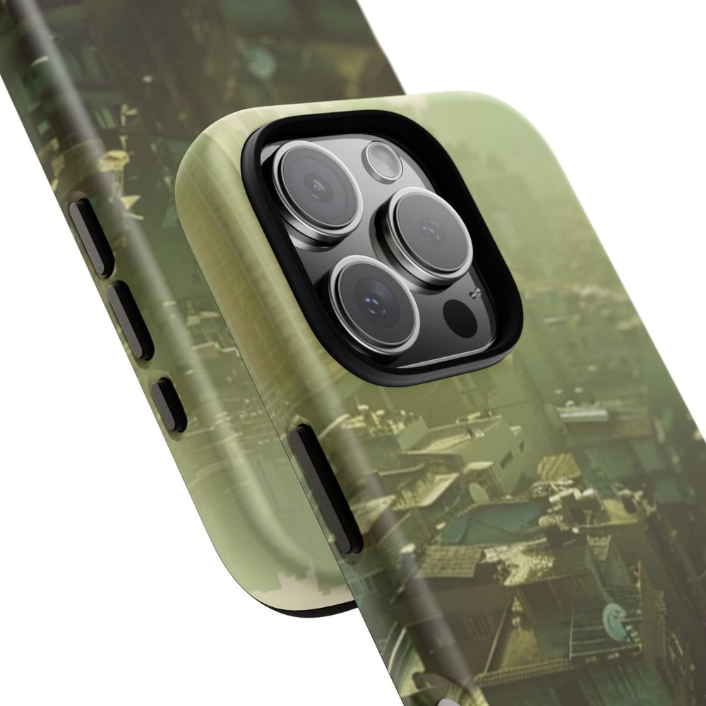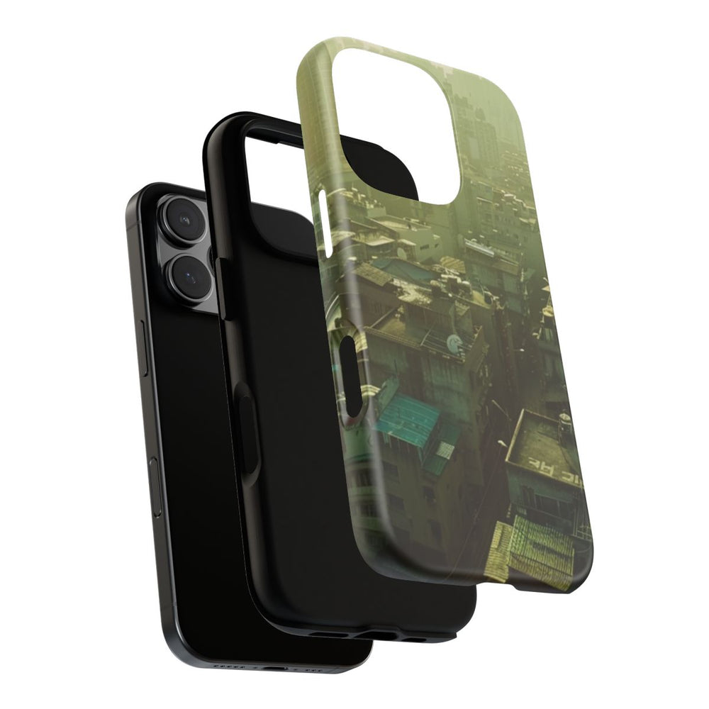 Dit hoesje toont een luchtfoto van een dichtbebouwde stedelijke woonwijk met veel laagbouw en smalle straten. Op de platte daken zijn verschillende bouwwerken en installaties te zien. Op de achtergrond zorgen moderne hoge gebouwen voor een opvallend contrast met de oudere buurt. De scène is gehuld in een zacht groenachtig-geel licht, wat zorgt voor een mysterieuze en sfeervolle uitstraling. Het hoesje bestaat uit twee lagen van polycarbonaat en TPU en ondersteunt draadloos opladen.