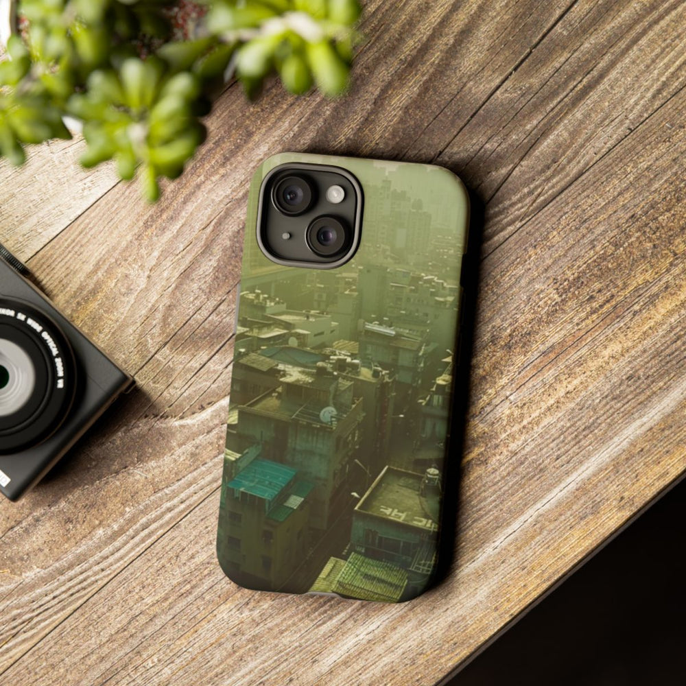 Dit telefoonhoesje toont een dichtbebouwd stadsgebied met een mix van lage panden en hoge flatgebouwen op de achtergrond. De lage gebouwen hebben platte daken met diverse installaties en enkele uitbouwen op het dak. Smalle straten lopen tussen de gebouwen door. Het zachte licht en de nevelige sfeer geven het geheel een gedempte geelgroene tint. Het hoesje is gemaakt van polycarbonaat en TPU en biedt zowel stevigheid als ondersteuning voor draadloos opladen.