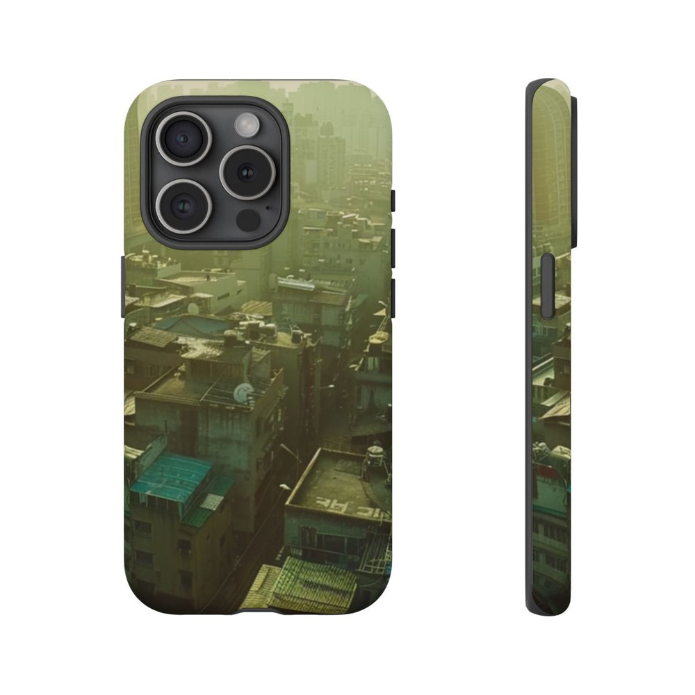 Dit hoesje toont een vogelvluchtperspectief op een dichtbebouwd stadsgebied met een mix van lage gebouwen met platte daken en hogere woontorens op de achtergrond. Smalle straten slingeren zich tussen de gebouwen, terwijl enkele daken zijn voorzien van extra structuren. De sfeer is licht nevelig met zachte, groenige tinten. Het stevige, matte hoesje bestaat uit twee lagen van polycarbonaat en TPU en is ontworpen voor optimale bescherming en ondersteuning van draadloos opladen.