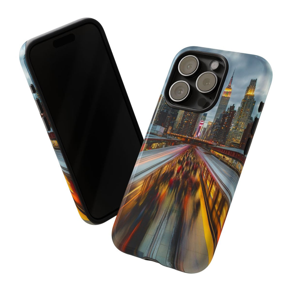 Dit ontwerp toont een levendig stadsgezicht met hoge wolkenkrabbers onder een bewolkte hemel. Op de voorgrond is een druk metroperron te zien, met aan beide zijden een trein en een menigte mensen die in beweging is vastgelegd, waardoor een dynamisch en energiek effect ontstaat. De gebouwen zijn sfeervol verlicht met warme tinten, wat mooi afsteekt tegen de koele kleuren van de lucht. De afbeelding is bedrukt op een glanzend en stevig hoesje van polycarbonaat en TPU, dat duurzame dubbele bescherming biedt en geschikt is voor draadloos opladen.