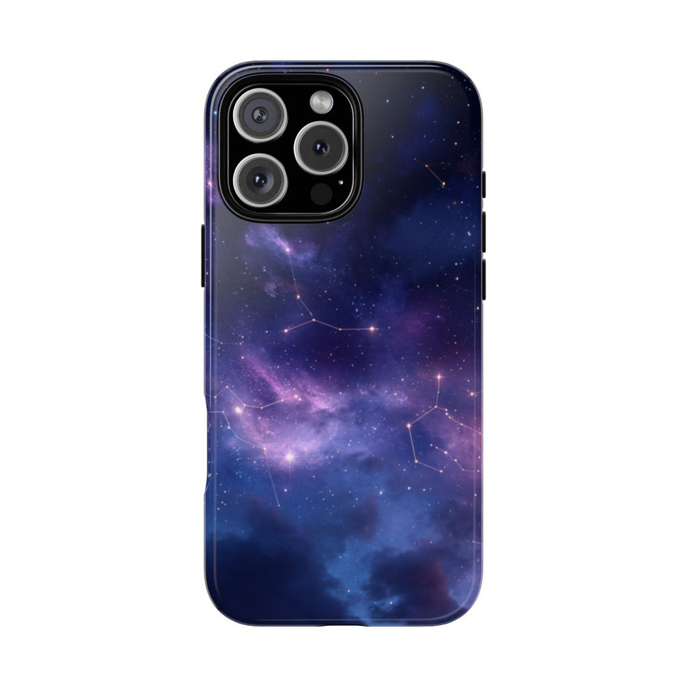 Dit ontwerp toont een diepe nachtelijke hemel vol fonkelende sterren en lichtgevende sterrenbeelden, verbonden door fijne lijnen. De achtergrond bestaat uit een mix van donkerblauwe en paarse tinten met subtiele roze en oranje nevels, wat zorgt voor een magische en hemelse sfeer. Onderaan zijn donkere wolken zichtbaar, die extra diepte geven aan het kosmische tafereel. Dit glanzende, stevige hoesje heeft een dubbele laag voor extra duurzaamheid en bescherming en ondersteunt draadloos opladen.