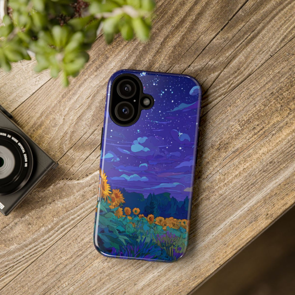 Dit hoesje is voorzien van een kleurrijk ontwerp met een levendig veld vol zonnebloemen onder een diepe nachtelijke hemel vol fonkelende sterren. Het tafereel is op een stijlvolle en expressieve manier geïllustreerd, waarbij rijke blauwtinten en paarse kleuren de lucht bepalen en felgele zonnebloemen met weelderig groene bladeren voor een mooi contrast zorgen. Hoge bomen aan de horizon geven het landschap extra diepte. Het hoesje bestaat uit twee lagen: een glanzende buitenkant van polycarbonaat en een binnenzijde van TPU, wat zorgt voor extra stevigheid en bescherming. Ondersteunt draadloos opladen.