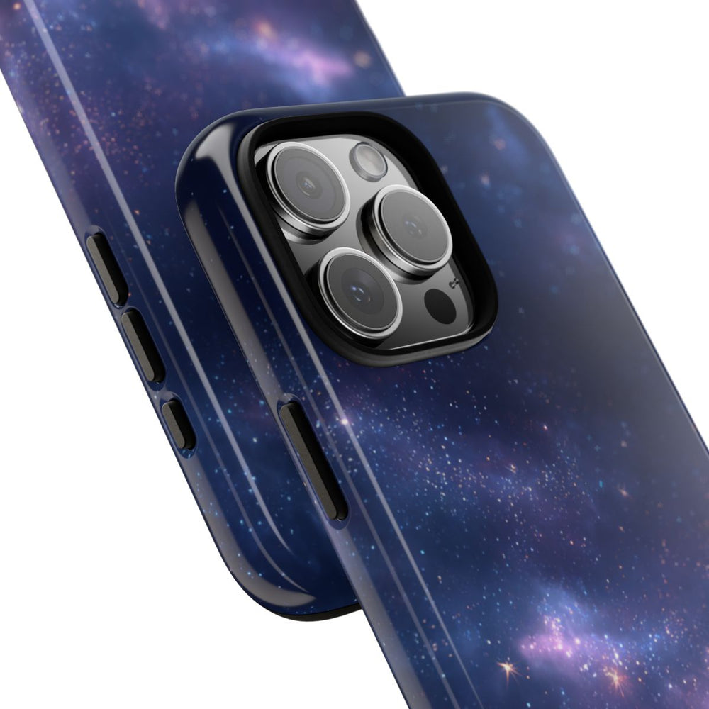 Dit ontwerp toont een diepe nachtelijke hemel vol talloze sterren en gloeiende nevels. Zachte blauwtinten en paars worden subtiel gemengd met roze en wit, wat zorgt voor een magisch en dromerig geheel. De sterren verschillen in grootte en helderheid en zijn verspreid over de lucht, waarbij sommige extra opvallen. Onderaan geven donkere wolken extra diepte en contrast aan het kosmische tafereel. De afbeelding is gedrukt op een glanzend en stevig hoesje met een polycarbonaat buitenkant en TPU binnenzijde, wat zorgt voor dubbele bescherming en ondersteuning van draadloos opladen.