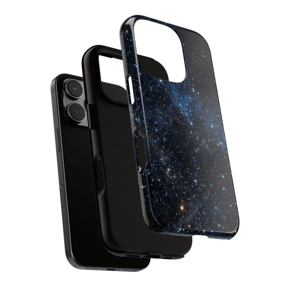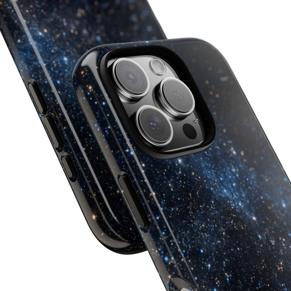 Dit ontwerp toont een gedetailleerd uitzicht op de diepe ruimte, waar talloze sterren verspreid zijn over een donkere achtergrond. De sterren verschillen in helderheid en kleur, met vooral blauwe en witte tinten en hier en daar een oranje gloed. Lichte slierten van kosmisch stof of nevelachtige vormen geven extra structuur en diepte aan het geheel. De afbeelding is bedrukt op een glanzend, stevig hoesje met een polycarbonaat buitenkant en een TPU-binnenzijde. Dit zorgt voor dubbele bescherming en maakt draadloos opladen mogelijk. Het hoesje is ontworpen voor duurzaamheid en bestand tegen gebruik buitenshuis.