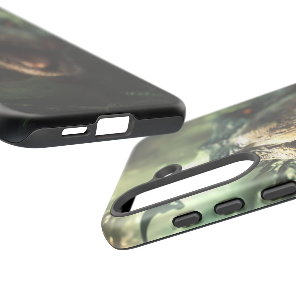 Dit ontwerp toont een gedetailleerde close-up van een stoere dinosaurus met scherpe tanden en oranje ogen in een dichtbegroeide jungle. Op de achtergrond vliegt een andere dinosaurus tussen hoge bomen en weelderig groene bladeren. De afbeelding is rijk aan groene en bruine tinten, wat zorgt voor een mysterieuze en wilde sfeer. Het hoesje bestaat uit twee lagen van polycarbonaat en TPU, heeft een matte afwerking, ondersteunt draadloos opladen en is bestand tegen verschillende weersomstandigheden.