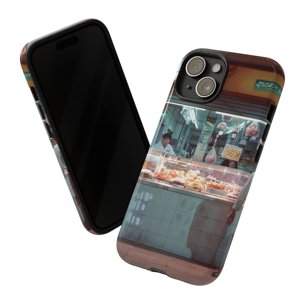 Dit telefoonhoesje toont een levendige straatvoedselkraam met een glazen vitrine vol diverse bereide gerechten. Voor de kraam staat een man in een wit overhemd en bruine broek die naar het eten kijkt. Achter de kraam is de verkoper te zien, gekleed in een witte jas en met een zwarte pet op. De omgeving heeft betegelde muren en een vloer, en het geheel wordt helder verlicht door tl-verlichting. Het hoesje heeft een glanzende, stevige buitenkant van polycarbonaat met een TPU-voering, waardoor het extra duurzaam is en geschikt voor draadloos opladen.