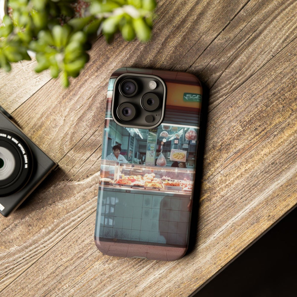 Dit telefoonhoesje toont een levendige straatvoedselkraam met een glazen vitrine vol diverse bereide gerechten. Voor de kraam staat een man in een wit overhemd en bruine broek die naar het eten kijkt. Achter de kraam is de verkoper te zien, gekleed in een witte jas en met een zwarte pet op. De omgeving heeft betegelde muren en een vloer, en het geheel wordt helder verlicht door tl-verlichting. Het hoesje heeft een glanzende, stevige buitenkant van polycarbonaat met een TPU-voering, waardoor het extra duurzaam is en geschikt voor draadloos opladen.