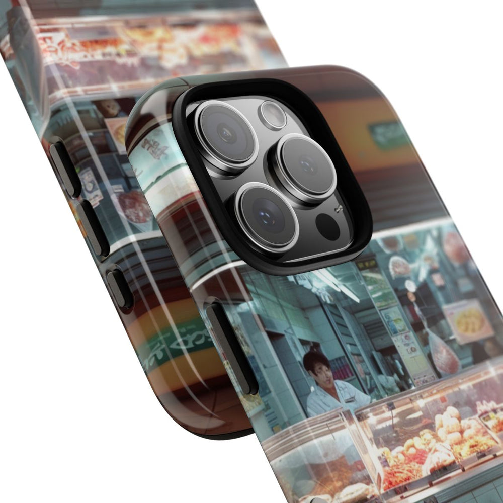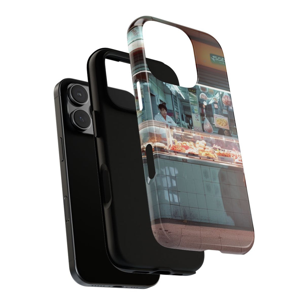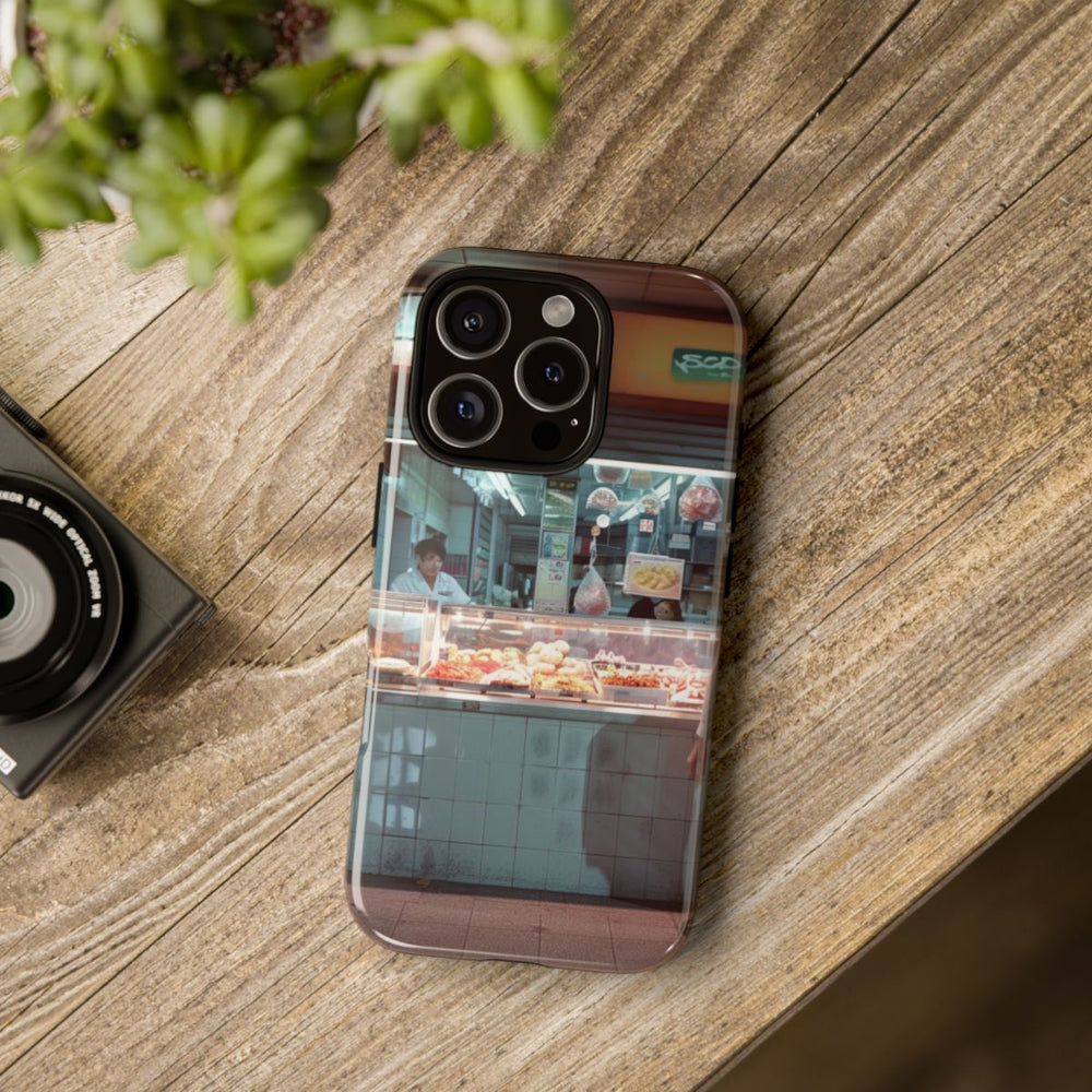 Dit telefoonhoesje toont een levendige straatvoedselkraam met een glazen vitrine vol diverse bereide gerechten. Voor de kraam staat een man in een wit overhemd en bruine broek die naar het eten kijkt. Achter de kraam is de verkoper te zien, gekleed in een witte jas en met een zwarte pet op. De omgeving heeft betegelde muren en een vloer, en het geheel wordt helder verlicht door tl-verlichting. Het hoesje heeft een glanzende, stevige buitenkant van polycarbonaat met een TPU-voering, waardoor het extra duurzaam is en geschikt voor draadloos opladen.