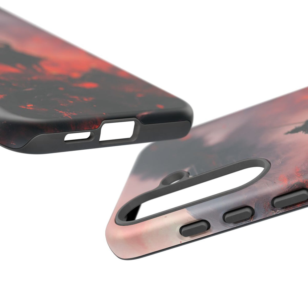 Dit hoesje toont een indrukwekkend tafereel van samurai die zich terugtrekken van een slagveld. Op de achtergrond zie je een rokerige lucht en een kasteel in de verte, wat zorgt voor een intense sfeer. De kleuren zijn levendig, met vurige rode tinten en donkere accenten die het ontwerp kracht bijzetten. Het hoesje is voorzien van een stevige dubbele laag voor extra bescherming en ondersteunt draadloos opladen. Het is speciaal ontworpen voor een perfecte pasvorm om het genoemde toestel.