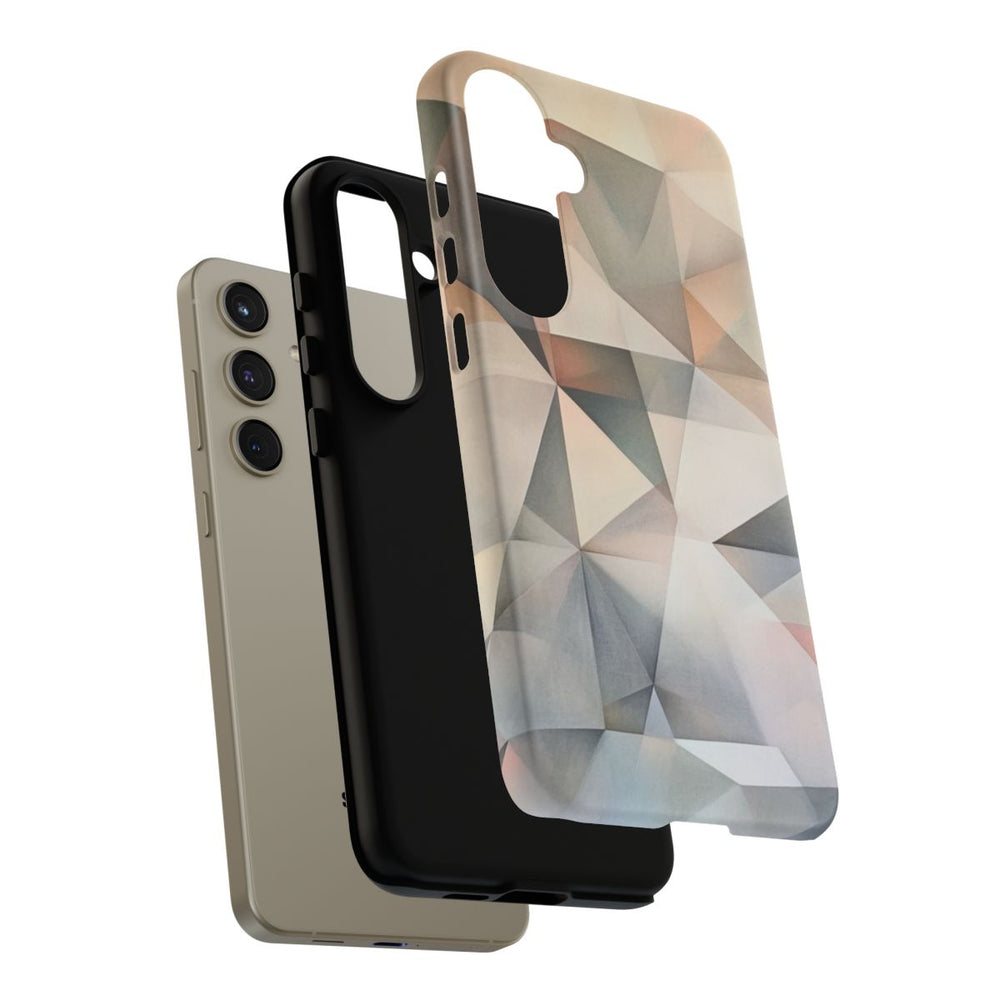 Dit hoesje is voorzien van een abstract geometrisch patroon met overlappende driehoeken en veelhoeken. De kleuren zijn zacht en ingetogen, met tinten grijs, beige en licht perzik voor een subtiele en elegante uitstraling. Het patroon heeft een vloeiend verloop, wat zorgt voor diepte en dimensie. Het matte hoesje bestaat uit twee lagen van polycarbonaat en TPU en biedt extra stevigheid en bescherming, ook buitenshuis. Geschikt voor draadloos opladen.