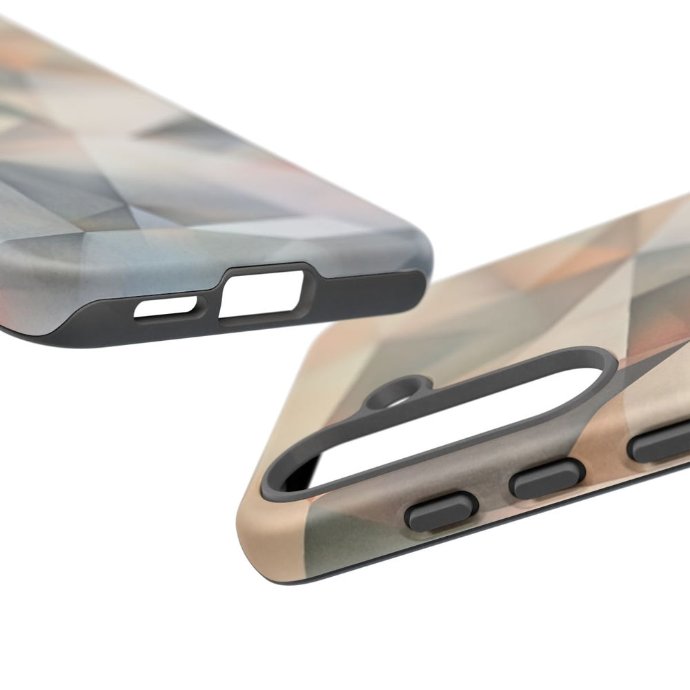 Dit hoesje heeft een geometrisch abstract patroon van overlappende driehoeken en veelhoeken. De kleuren zijn zachte, subtiele pasteltinten zoals beige, grijs en gedempt perzik. Door de gelaagde vormen en zachte kleurverlopen ontstaat een gevoel van diepte en complexiteit. Het hoesje bestaat uit twee stevige lagen van polycarbonaat en TPU, wat zorgt voor extra duurzaamheid en bescherming. Ondersteunt draadloos opladen.