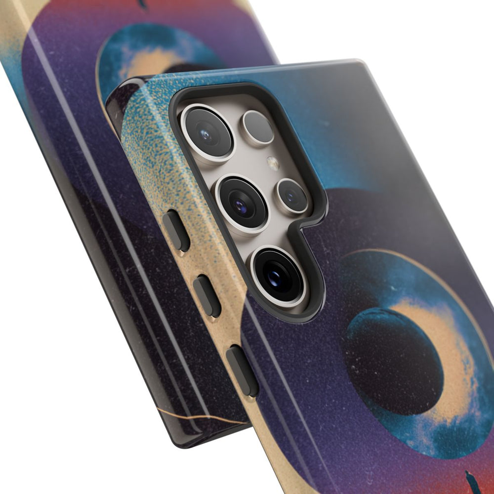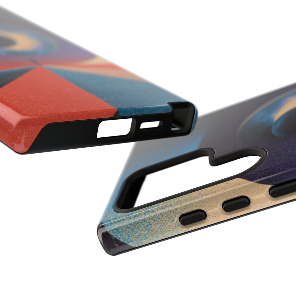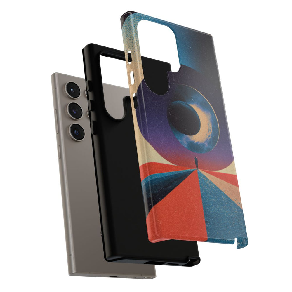 Dit telefoonhoesje heeft een opvallend ontwerp met een surrëele, geometrische compositie. Een grote spiraalvorm leidt naar een centraal rond portaal, terwijl de achtergrond verloopt van donker naar licht en is voorzien van een subtiele, vintage textuur. In het midden staat een eenzame silhouet op het punt waar de spiraal samenkomt, wat zorgt voor een mysterieuze dieptewerking. Op de voorgrond zijn krachtige, hoekige vormen in rood- en blauwtinten te zien die richting de figuur wijzen. Het hoesje is glanzend afgewerkt, biedt stevige dubbele bescherming en is geschikt voor draadloos opladen.