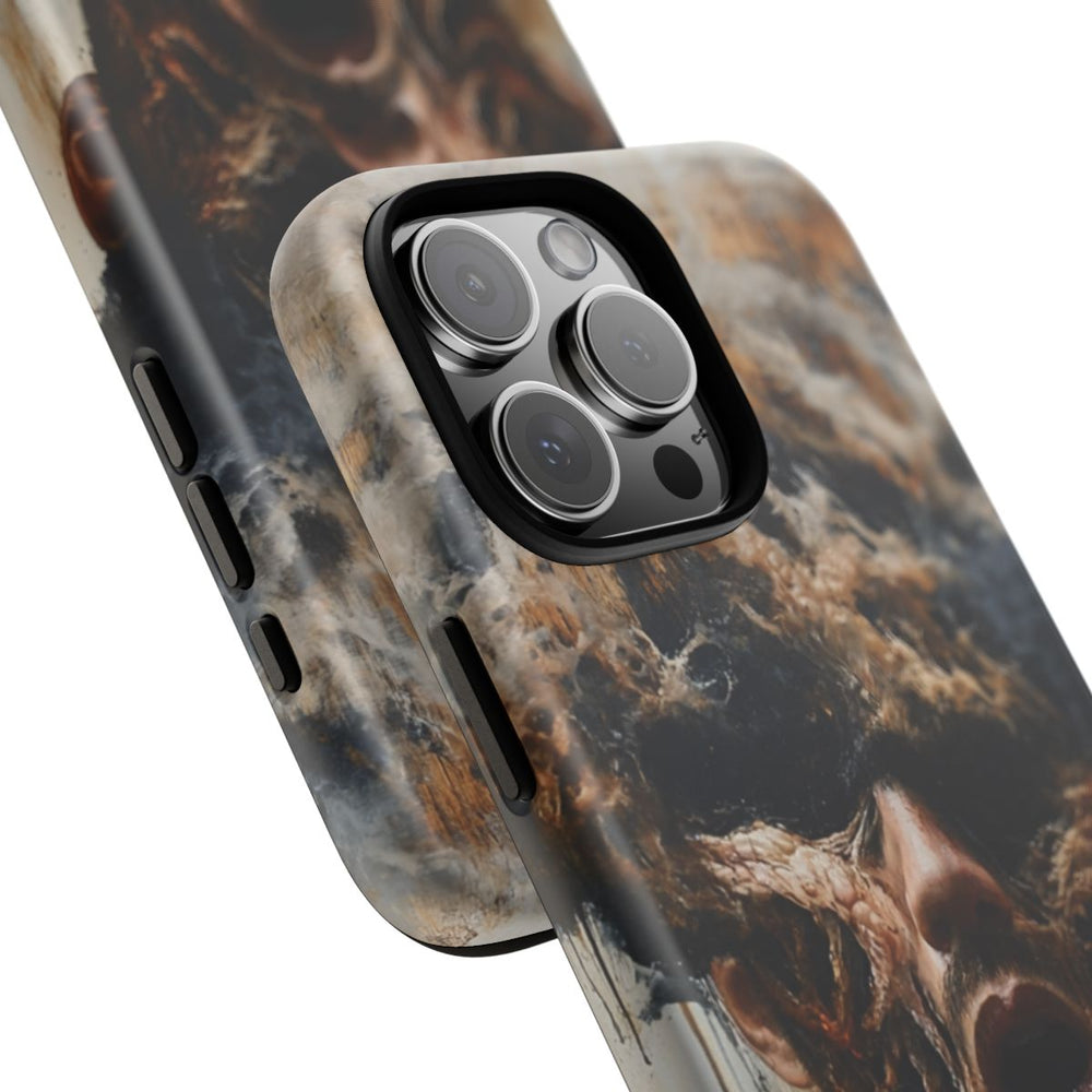 Dit hoesje is voorzien van een surrealistisch en abstract portret van een persoon met een vervormd gezicht dat lijkt te versmelten met rook en donkere structuren. Het gezicht is gedetailleerd uitgewerkt, met rokerige elementen die omhoog kringelen en samenvloeien met een beige en grijze achtergrond. De persoon draagt een ingetogen grijs shirt en het geheel heeft een aardse kleurstelling met zwart, bruin en beige tinten. Het hoesje bestaat uit twee lagen, heeft een matte afwerking en is gemaakt van polycarbonaat en TPU. Geschikt voor draadloos opladen.