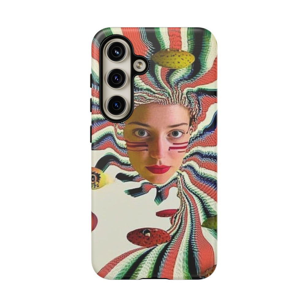Dit hoesje heeft een surrealistisch menselijk gezicht met rode accenten op de wangen en opvallend rode lippen. Rond het gezicht lopen golvende, veelkleurige strepen in rood, groen, zwart en wit die naar buiten uitstralen. Verspreid rondom zweven verschillende kleine, gedessineerde bollen op een lichtbeige achtergrond. Het hoesje is mat en stevig uitgevoerd met een dubbele laag van polycarbonaat en TPU, waardoor het extra bescherming biedt en geschikt is voor draadloos opladen.