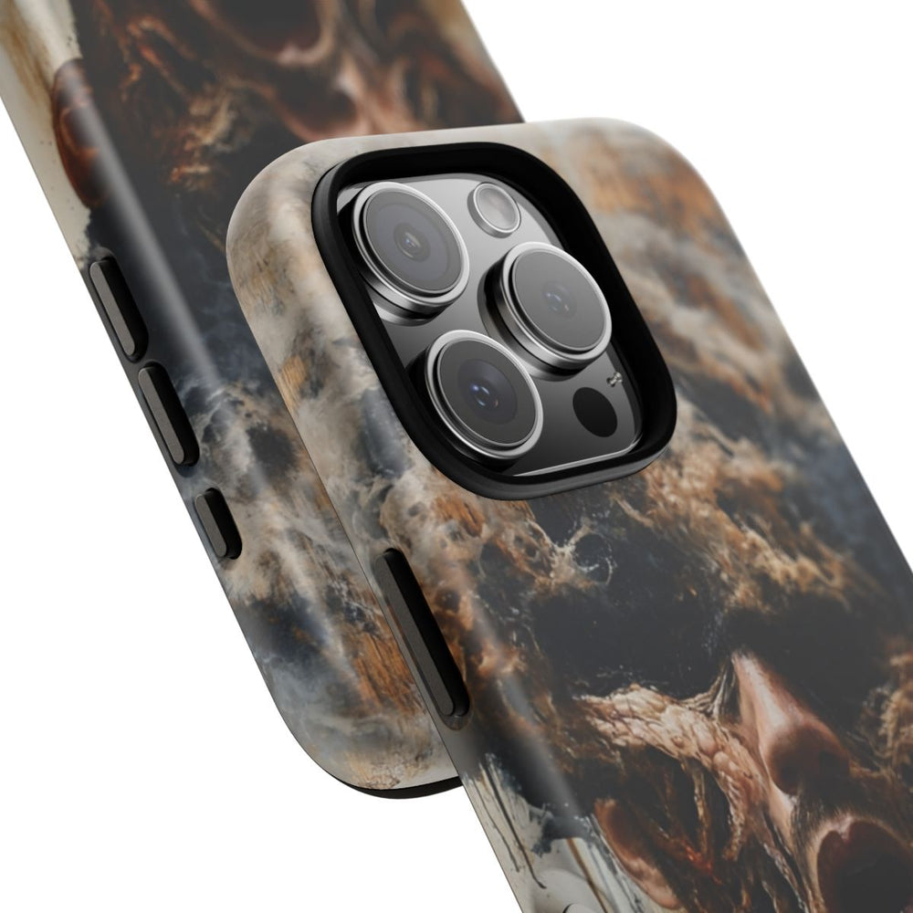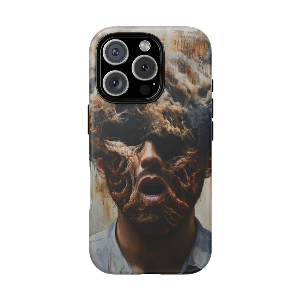 Dit hoesje toont een surrealistisch portret van een persoon, waarvan het gezicht deels wordt verhuld door donkere rook en wortelachtige, organische structuren. De figuur draagt een grijs shirt en de achtergrond heeft een lichte, neutrale tint met subtiele verfspatten. Het geheel straalt een mysterieuze, abstracte sfeer uit, waarbij aardetinten en diepzwart de boventoon voeren. Het hoesje is gemaakt van polycarbonaat met een TPU-voering en biedt dubbele bescherming. Geschikt voor draadloos opladen.