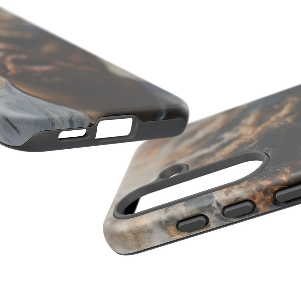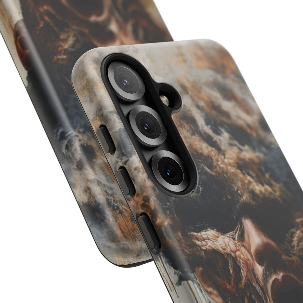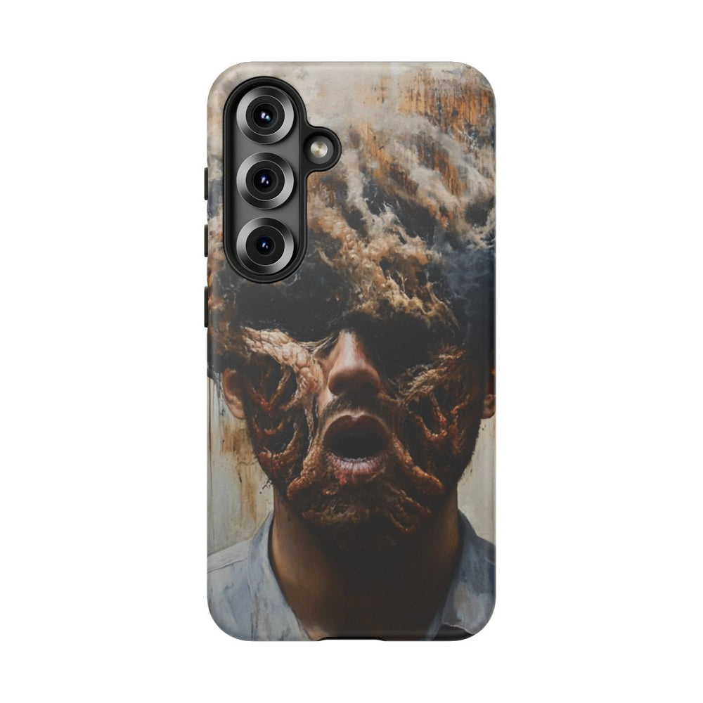 Dit hoesje heeft een surrealistisch portret van een persoon waarvan het gezicht deels wordt bedekt door donkere rook en wortelachtige, organische structuren die zich over de huid verspreiden. De figuur draagt een grijs shirt en de achtergrond is licht en neutraal met subtiele abstracte accenten. Het hoesje is stevig dankzij de dubbele laag van polycarbonaat en TPU, biedt extra bescherming en ondersteunt draadloos opladen.