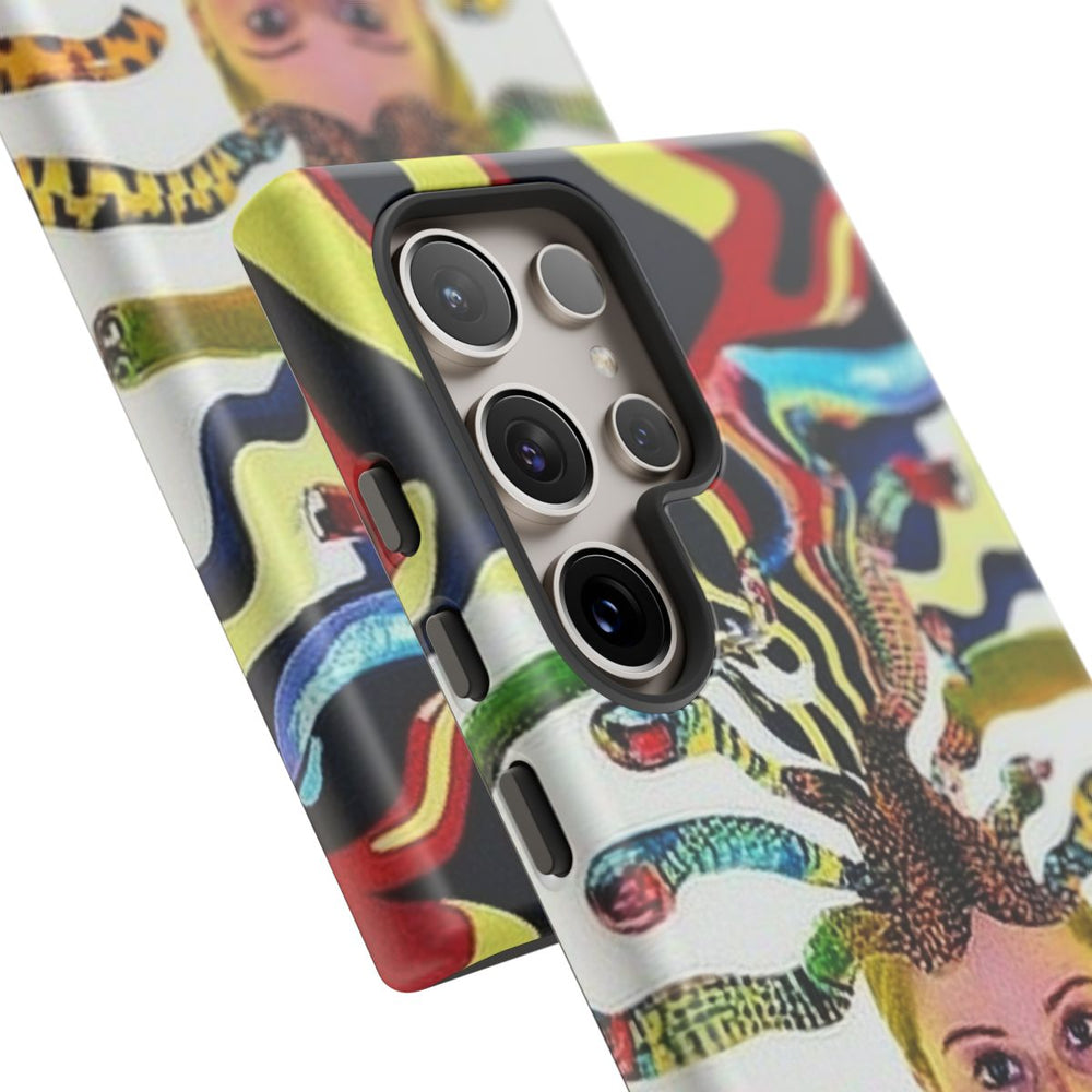 Dit hoesje is voorzien van een surrealistisch portret van een vrouw met meerdere kleurrijke slangen die als haar uit haar hoofd groeien. De slangen hebben uiteenlopende patronen en felle kleuren zoals geel, rood, blauw en groen. De witte achtergrond laat de levendige kleuren extra opvallen. Het matte, stevige hoesje bestaat uit twee lagen van polycarbonaat en TPU, waardoor het duurzaam is en draadloos opladen ondersteunt.