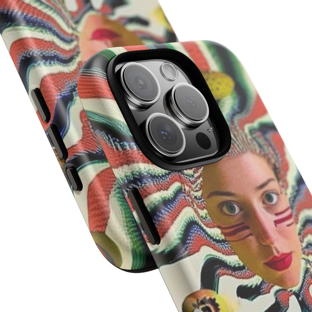 Dit hoesje is voorzien van een surrealistisch ontwerp met het gezicht van een vrouw, felrode lippen en rode strepen op haar wangen. Rond haar hoofd lopen golvende, gestreepte patronen in rood, zwart, groen en wit die naar buiten uitstralen. Verspreid rondom het gezicht zweven kleurrijke bollen met verschillende texturen en patronen. De achtergrond heeft een lichte crèmekleur. Het hoesje bestaat uit twee lagen van polycarbonaat en TPU en heeft een matte afwerking. Geschikt voor draadloos opladen.