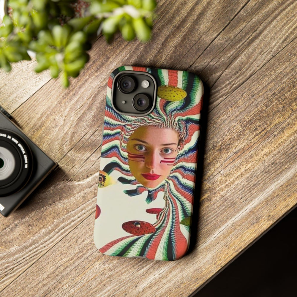 Dit hoesje heeft een opvallend surrealistisch portret van een vrouw met felrode lippen en rode strepen op haar wangen. Haar haar en lichaam vloeien over in golvende, kleurrijke strepen in rood, groen, zwart en wit, die naar buiten toe uitstralen. Rondom haar zweven ovale vormen met verschillende patronen en kleuren. De achtergrond is licht crèmekleurig. Het hoesje bestaat uit een stevige polycarbonaat buitenkant en een TPU binnenlaag, wat zorgt voor dubbele bescherming en ondersteuning van draadloos opladen.