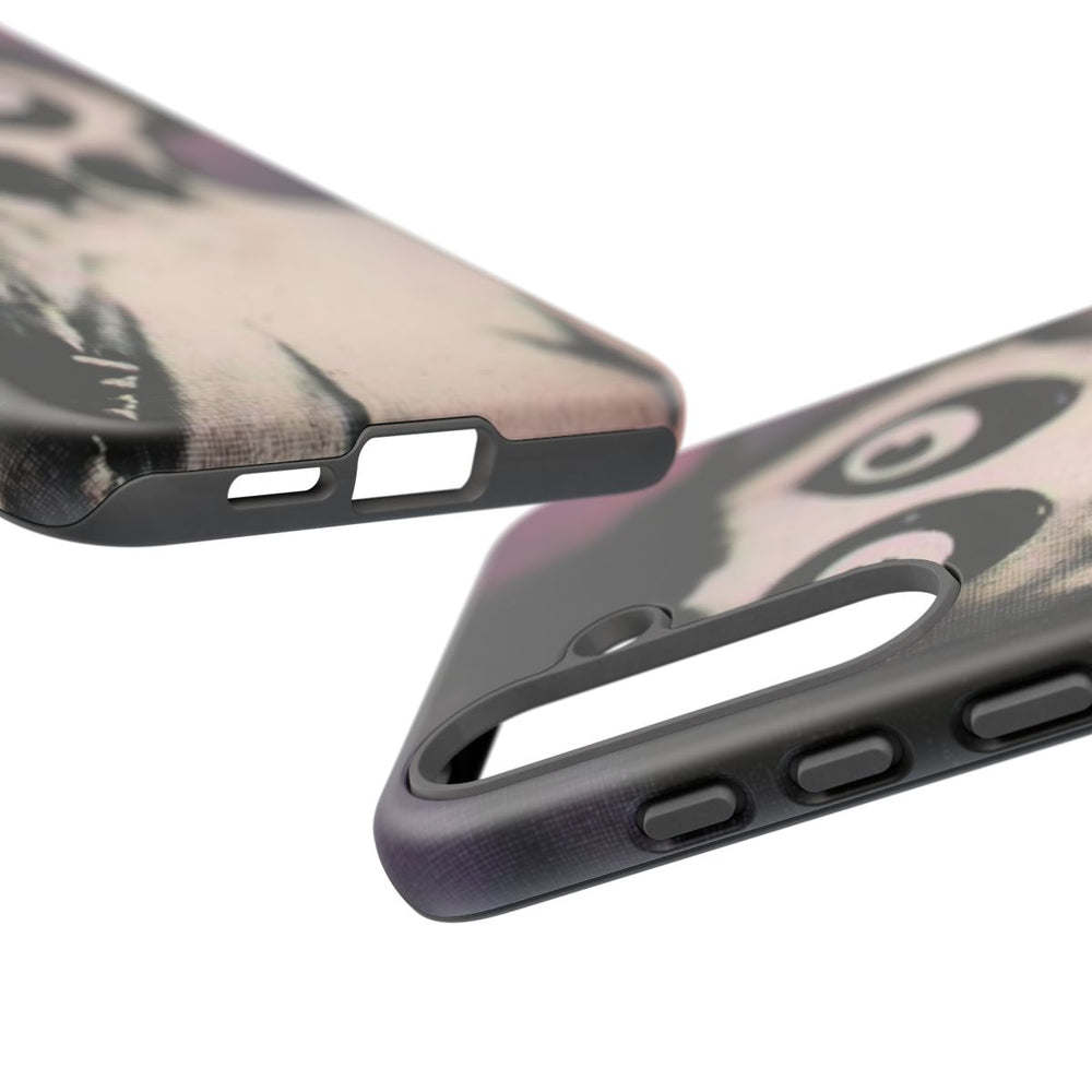 Dit hoesje heeft een ontwerp met een surrealistisch figuur, gekenmerkt door grote, ronde ogen en meerdere donkere vlekken op het gezicht. Het wezen heeft een getextureerd, gebroken wit lichaam en een donker, stekelig gedeelte bovenop. De achtergrond bestaat uit een verloop van paarse en roze tinten, wat zorgt voor een mysterieuze en onheilspellende sfeer. Het hoesje is voorzien van twee lagen: een stevige polycarbonaat buitenkant en een TPU binnenzijde. Geschikt voor draadloos opladen en bestand tegen gebruik buitenshuis.