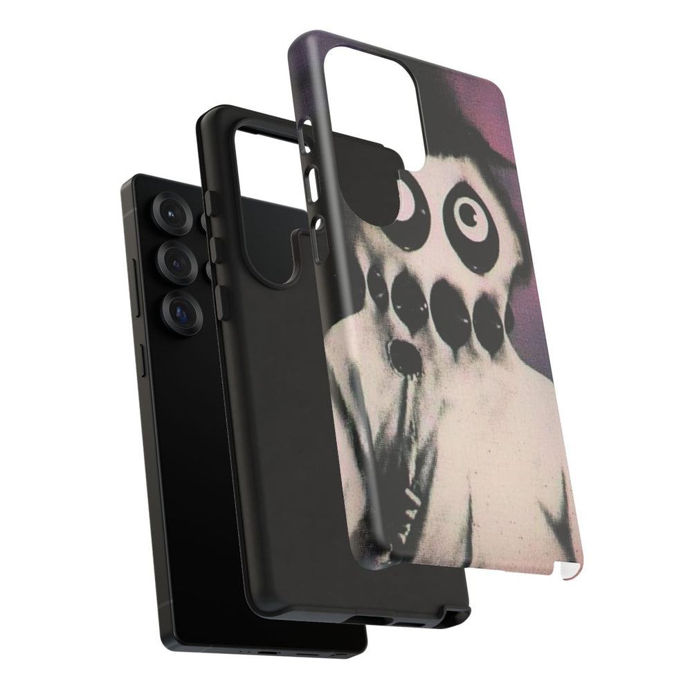 Dit telefoonhoesje is voorzien van een opvallend ontwerp met een surrealistisch figuur dat grote, ronde ogen en meerdere donkere vlekken op het gezicht heeft. Het wezen heeft een lichte huid en donker, stekelig haar, geplaatst tegen een achtergrond met een paarse en zwarte kleurverloop. Het hoesje bestaat uit twee lagen: een stevige polycarbonaat buitenkant en een TPU-binnenzijde. Hierdoor is het geschikt voor draadloos opladen en biedt het bescherming tegen weersinvloeden.