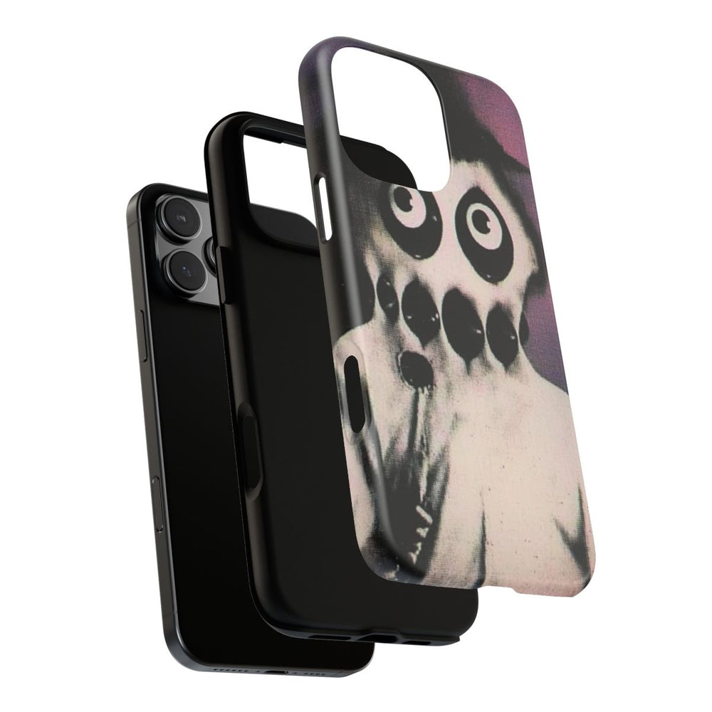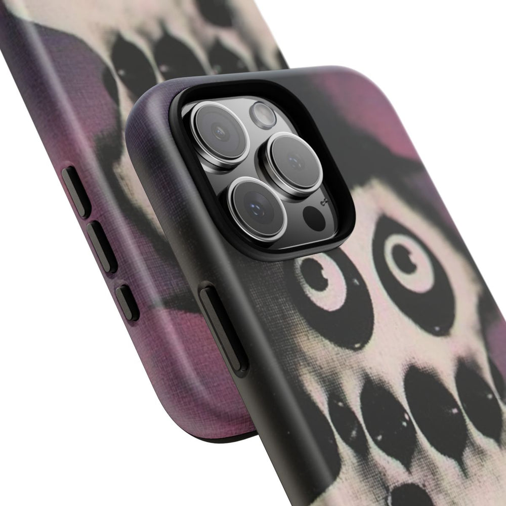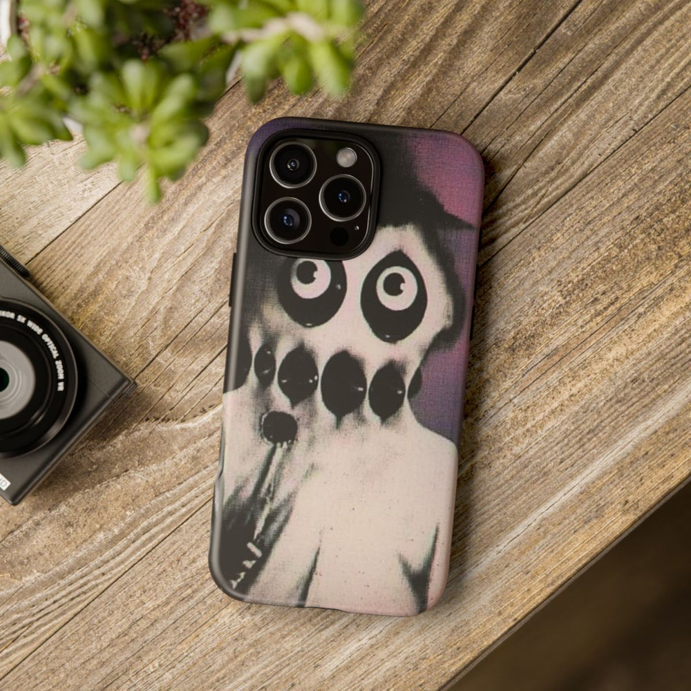 Dit telefoonhoesje toont een surrealistisch figuur met grote, ronde ogen en meerdere zwarte vlekken op het gezicht, geplaatst tegen een donkerpaarse en zwarte, vervaagde achtergrond. Het figuur lijkt een lichtgekleurde outfit te dragen. De afbeelding heeft een getextureerd, korrelig effect. Het hoesje bestaat uit twee lagen met een matte afwerking, vervaardigd uit polycarbonaat en TPU. Het ondersteunt draadloos opladen en biedt bescherming tegen weersinvloeden buiten.