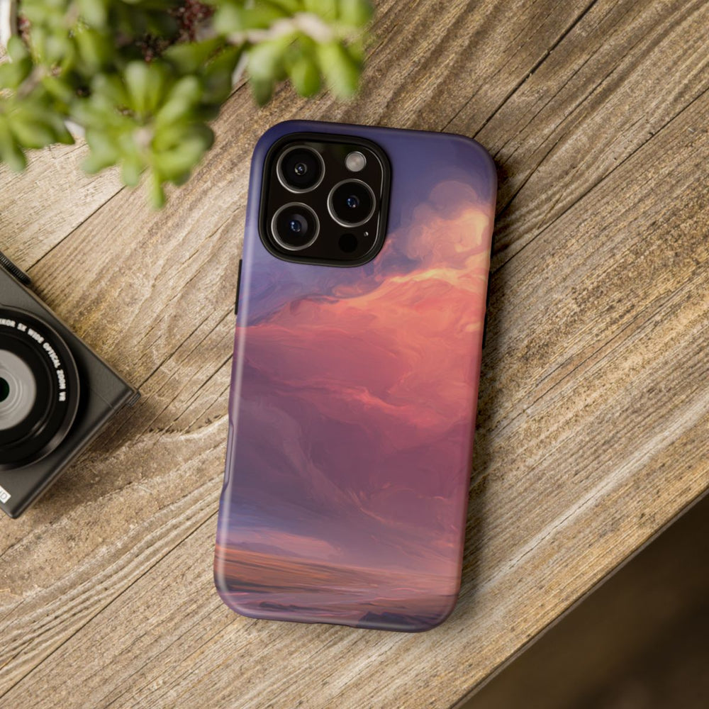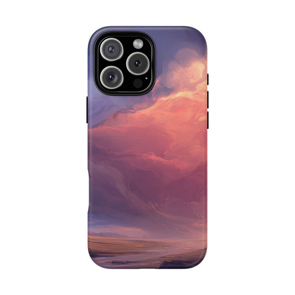Dit telefoonhoesje toont een surrealistisch landschap met een uitgestrekte open vlakte onder een indrukwekkende lucht, waarin draaiende wolken in paarse, roze en oranje tinten te zien zijn. Rechts staat een enkele persoon die uitkijkt over de horizon. Links prijkt een klein gebouw op een rotsachtige heuvel. De afbeelding heeft een schilderachtige en zeer gedetailleerde stijl. Het hoesje bestaat uit twee lagen met een matte afwerking en is gemaakt van polycarbonaat en TPU. Geschikt voor draadloos opladen.