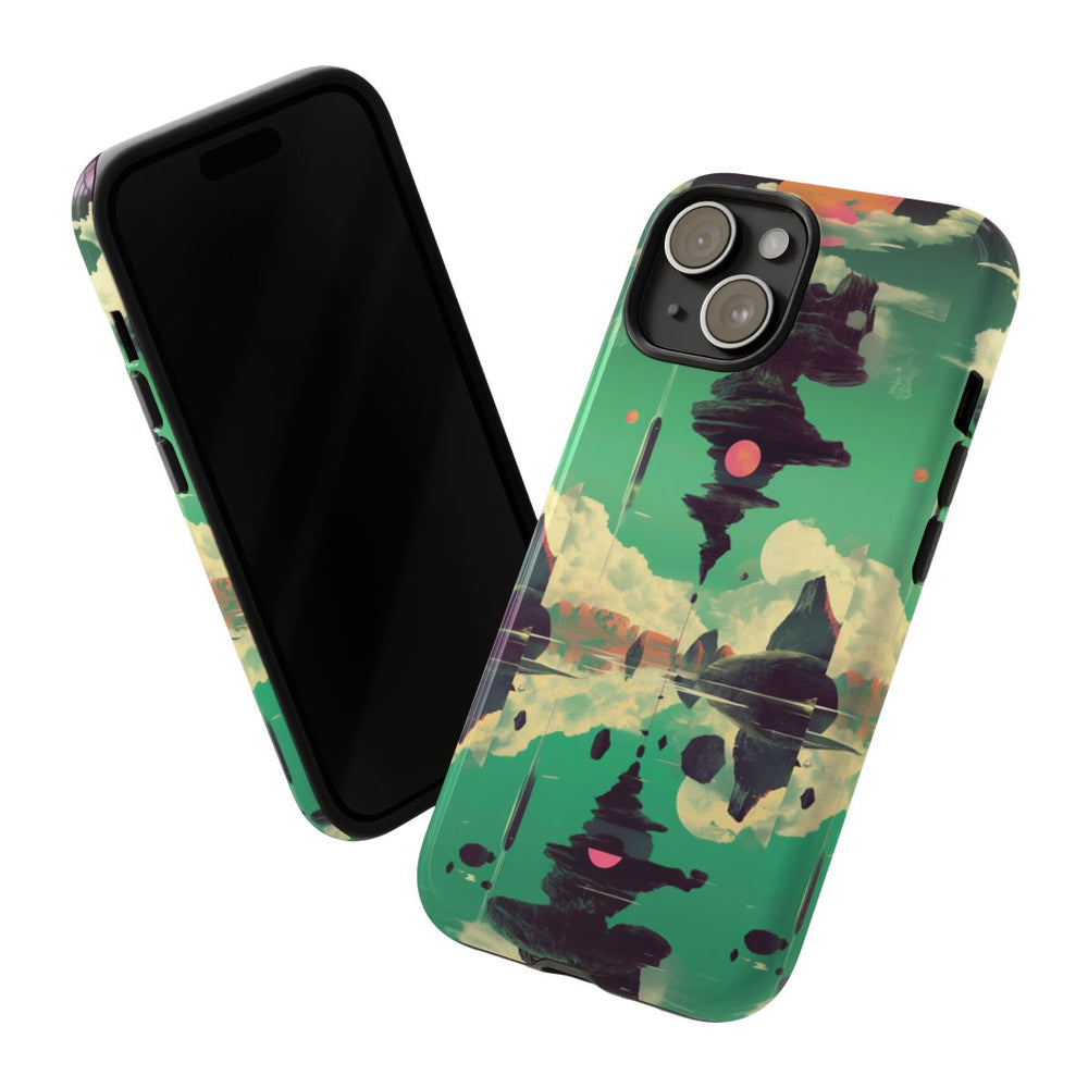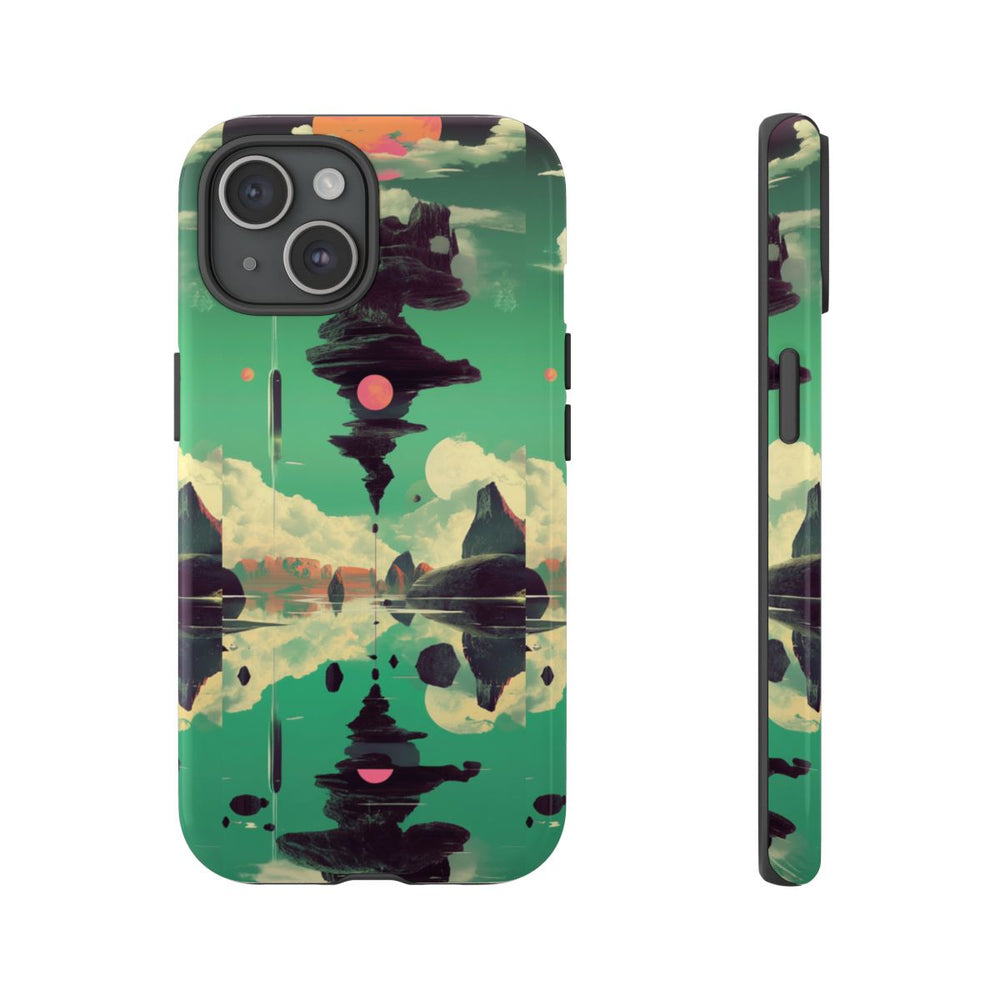 Dit hoesje heeft een surrealistisch ontwerp met een zwevende rotsformatie tegen een groene lucht met grote, witte wolken. Twee opvallende roze zonnen zijn zichtbaar: één bovenaan en één in het midden van de rotsformatie. De rotsen en zonnen weerspiegelen op het rustige wateroppervlak onder de scène. De kleuren zijn voornamelijk groen, roze en donker gesteente. Het hoesje is glanzend en stevig, gemaakt met een polycarbonaat buitenkant en een TPU-binnenzijde voor dubbele bescherming. Geschikt voor draadloos opladen.