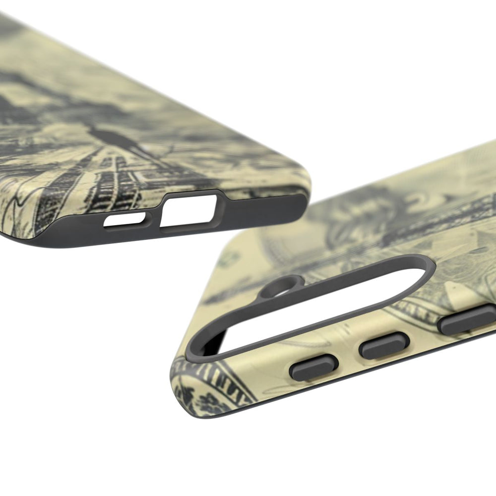 Dit hoesje is voorzien van een zwart-witte, surrealistische illustratie waarop de Eiffeltoren prominent op een groot dollarbiljet staat. Een eenzame figuur loopt richting de toren, omgeven door gelaagde details van valuta en handgeschreven tekst. De tekening heeft een schetsmatige pen-en-inkt stijl met een minimalistisch kleurgebruik, wat zorgt voor een conceptuele en redactionele uitstraling. Het hoesje bestaat uit twee lagen: een stevige polycarbonaat buitenkant en een TPU binnenzijde. Geschikt voor draadloos opladen.