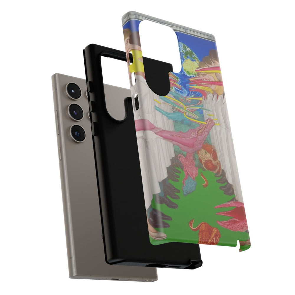 Dit hoesje toont twee rijen mensen die elkaar aankijken, allemaal gekleed in witte jassen en schoenen. Hun gezichten zijn vervormd met langgerekte, kleurrijke snavelachtige vormen in roze en geel. Tussen de groepen zweeft een grote, gedetailleerde aardbol tegen een diepblauwe achtergrond. Onderaan liggen surrealistische roze en rode dierenkoppen en abstracte vormen op een felgroene vloer. Bovenin is een langwerpig object te zien dat doet denken aan een vintage elektronisch apparaat, met rode tekst erboven. Het hoesje is gemaakt van polycarbonaat en TPU, wat zorgt voor stevigheid en ondersteuning van draadloos opladen.