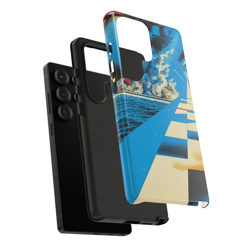 Dit hoesje toont een surrealistische oceaanscène met een groot schaakbordpad dat zich over het water uitstrekt. Links is een stadsgezicht te zien, waarachter rook of wolken opstijgen. Boven de stad zweeft een grote bolvormige structuur. Rechtsboven kijkt een gestileerd menselijk oog richting het pad. De achtergrond en het kleurgebruik zijn voornamelijk in levendige blauwtinten uitgevoerd. Het hoesje heeft een glanzende, stevige afwerking met een duurzame dubbele laag, is geschikt voor draadloos opladen en biedt bescherming tegen verschillende weersomstandigheden.