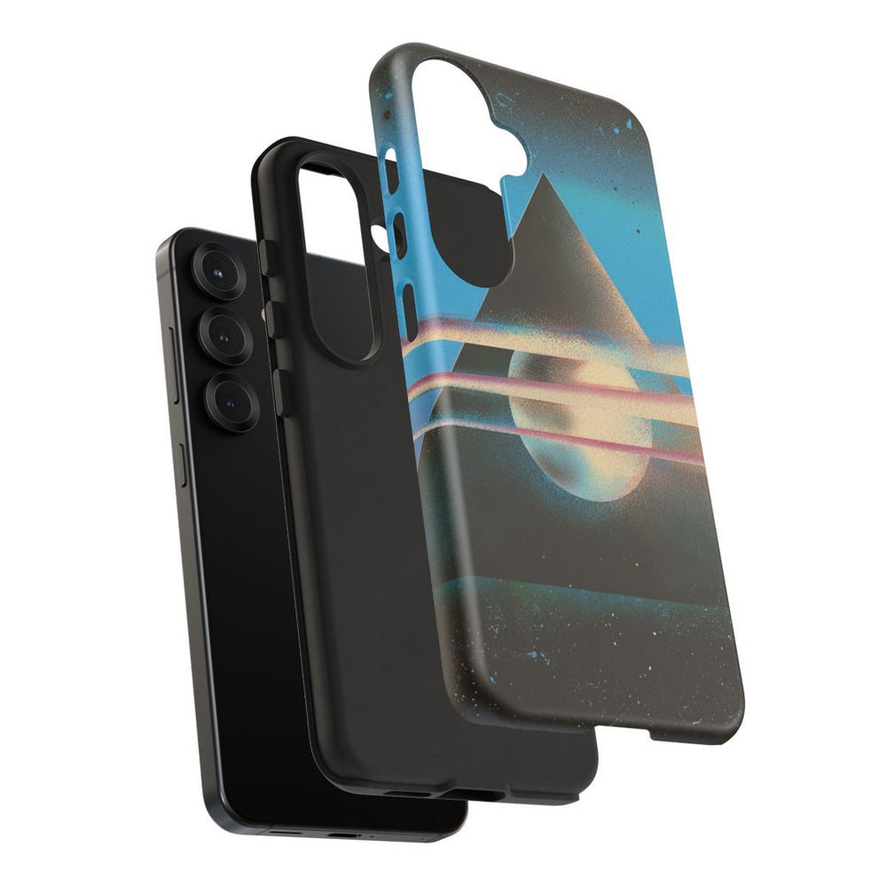 Dit hoesje heeft een opvallend ontwerp met een grote zwarte piramide waarin centraal een gloeiende bol zichtbaar is. Zachte lichtstralen in roze en wit lopen horizontaal door de piramide, wat zorgt voor een surrealistisch effect. De achtergrond verloopt van diepzwart aan de boven- en onderkant naar een levendige blauw-rode kleur in het midden. De afbeelding heeft een licht korrelige textuur, wat het geheel een retro uitstraling geeft. Het stevige hoesje bestaat uit twee lagen: een matte polycarbonaat buitenkant en een TPU-binnenzijde. Geschikt voor draadloos opladen.