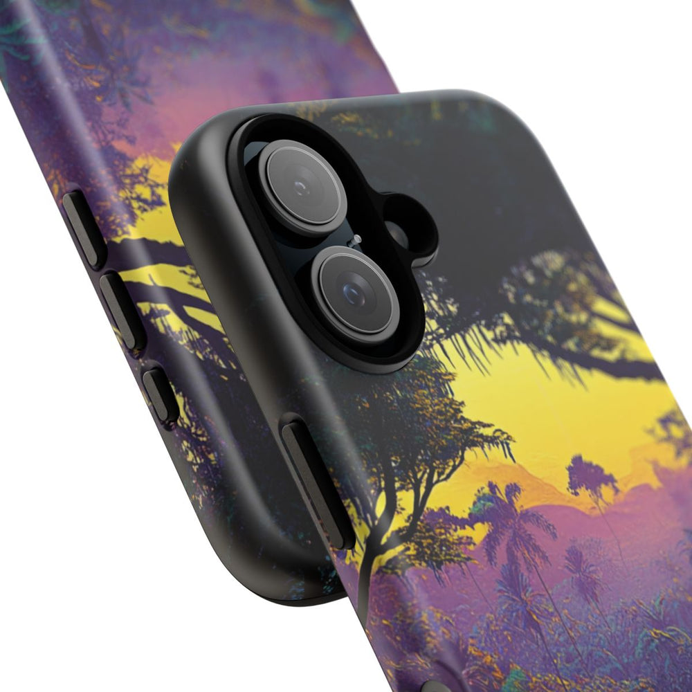 Dit ontwerp toont een surrealistisch jungletafereel met een levendige gele en paarse zonsondergang die het dichte groen verlicht. Bijzondere bomen en diverse planten zorgen voor een weelderige, tropische sfeer. Op de achtergrond zijn in de verte heuvels te zien, wat extra diepte aan het geheel geeft. Het hoesje is gemaakt van een stevige polycarbonaat buitenkant met een TPU binnenzijde en biedt optimale bescherming, terwijl draadloos opladen mogelijk blijft. Perfect voor natuurliefhebbers en iedereen die houdt van unieke kunstwerken.