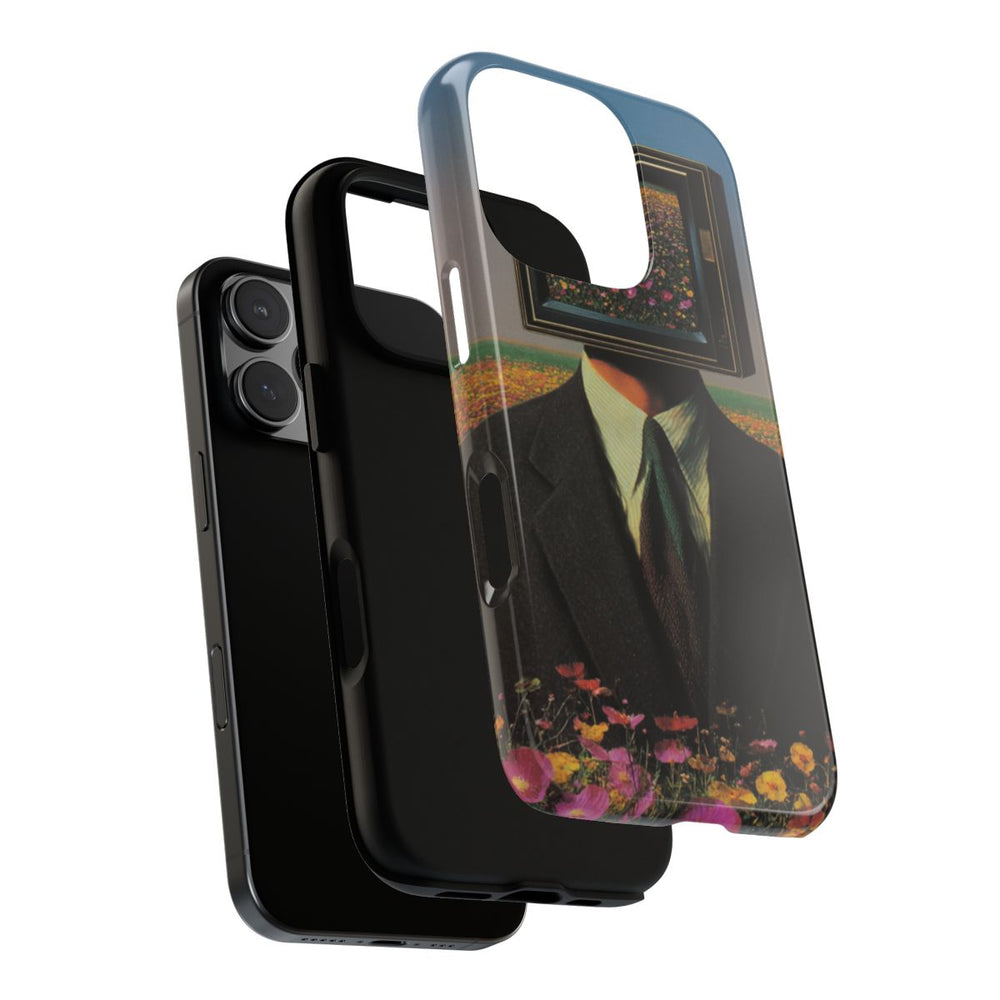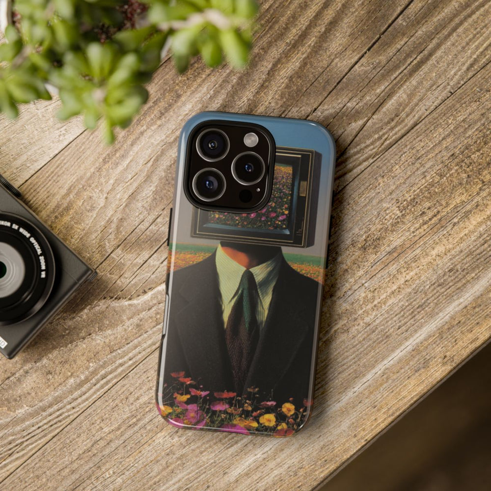 Dit hoesje toont een surrealistisch beeld van een man in een donker pak met stropdas, staand in een uitgestrekt veld vol kleurrijke bloemen. In plaats van een hoofd heeft de man een ouderwetse televisie waarop hetzelfde bloemenveld te zien is, wat zorgt voor een bijzonder visueel effect. De achtergrond bestaat uit een heldere lucht met een verloop van blauw naar zachtroze tinten. Het hoesje is glanzend afgewerkt en stevig uitgevoerd, gemaakt van duurzaam polycarbonaat en TPU. Dankzij de dubbele beschermlaag is je telefoon optimaal beschermd en draadloos opladen blijft mogelijk.