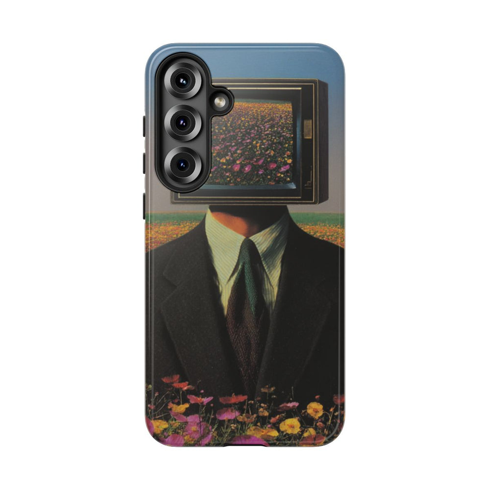 Dit hoesje toont een surrealistisch beeld van een man in een donker pak met stropdas, staand in een uitgestrekt veld vol kleurrijke bloemen. In plaats van een hoofd heeft de man een ouderwetse televisie waarop hetzelfde bloemenveld te zien is, wat zorgt voor een bijzonder visueel effect. De achtergrond bestaat uit een heldere lucht met een verloop van blauw naar zachtroze tinten. Het hoesje is glanzend afgewerkt en stevig uitgevoerd, gemaakt van duurzaam polycarbonaat en TPU. Dankzij de dubbele beschermlaag is je telefoon optimaal beschermd en draadloos opladen blijft mogelijk.
