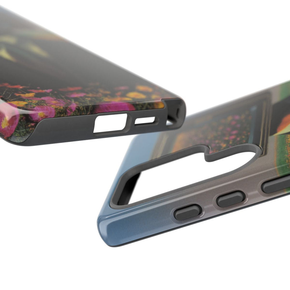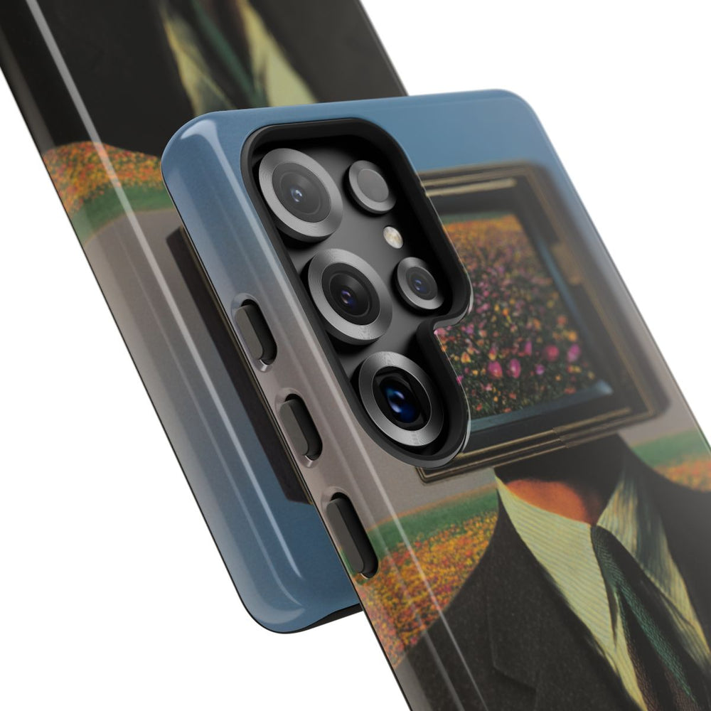 Dit hoesje toont een surrealistisch beeld van een man in een donker pak met stropdas, staand in een uitgestrekt veld vol kleurrijke bloemen. In plaats van een hoofd heeft de man een ouderwetse televisie waarop hetzelfde bloemenveld te zien is, wat zorgt voor een bijzonder visueel effect. De achtergrond bestaat uit een heldere lucht met een verloop van blauw naar zachtroze tinten. Het hoesje is glanzend afgewerkt en stevig uitgevoerd, gemaakt van duurzaam polycarbonaat en TPU. Dankzij de dubbele beschermlaag is je telefoon optimaal beschermd en draadloos opladen blijft mogelijk.