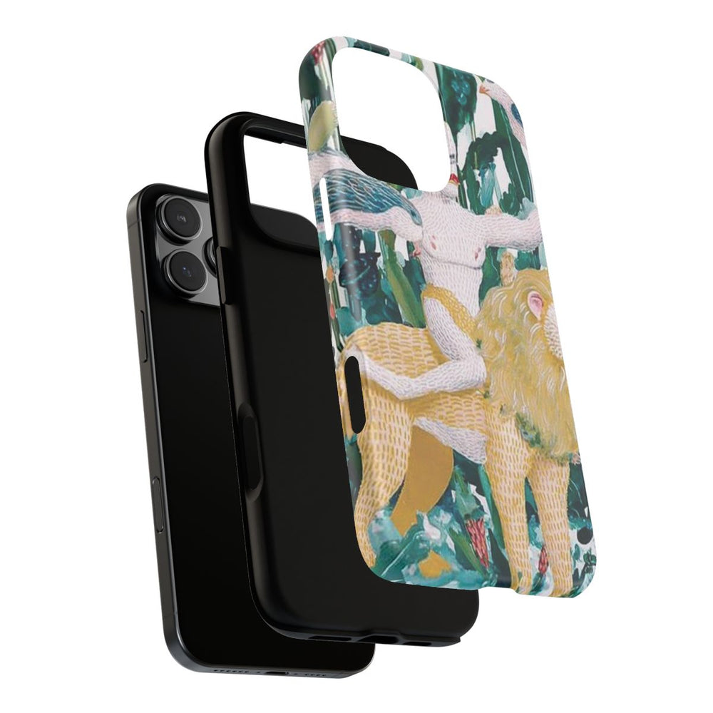 Dit hoesje toont een surrealistische illustratie van een man met een snor en lichte huid, zittend op een grote leeuw met een goudkleurige manen. Op beide uitgestrekte armen van de man zitten vogels. De achtergrond bestaat uit hoge groene planten en rode bloemen, wat zorgt voor een weelderige, jungle-achtige sfeer. Het kunstwerk heeft een getextureerde, patroonrijke stijl met een combinatie van natuurlijke en fantasierijke elementen. Het hoesje is gemaakt met een dubbele laag voor extra stevigheid en ondersteunt draadloos opladen.