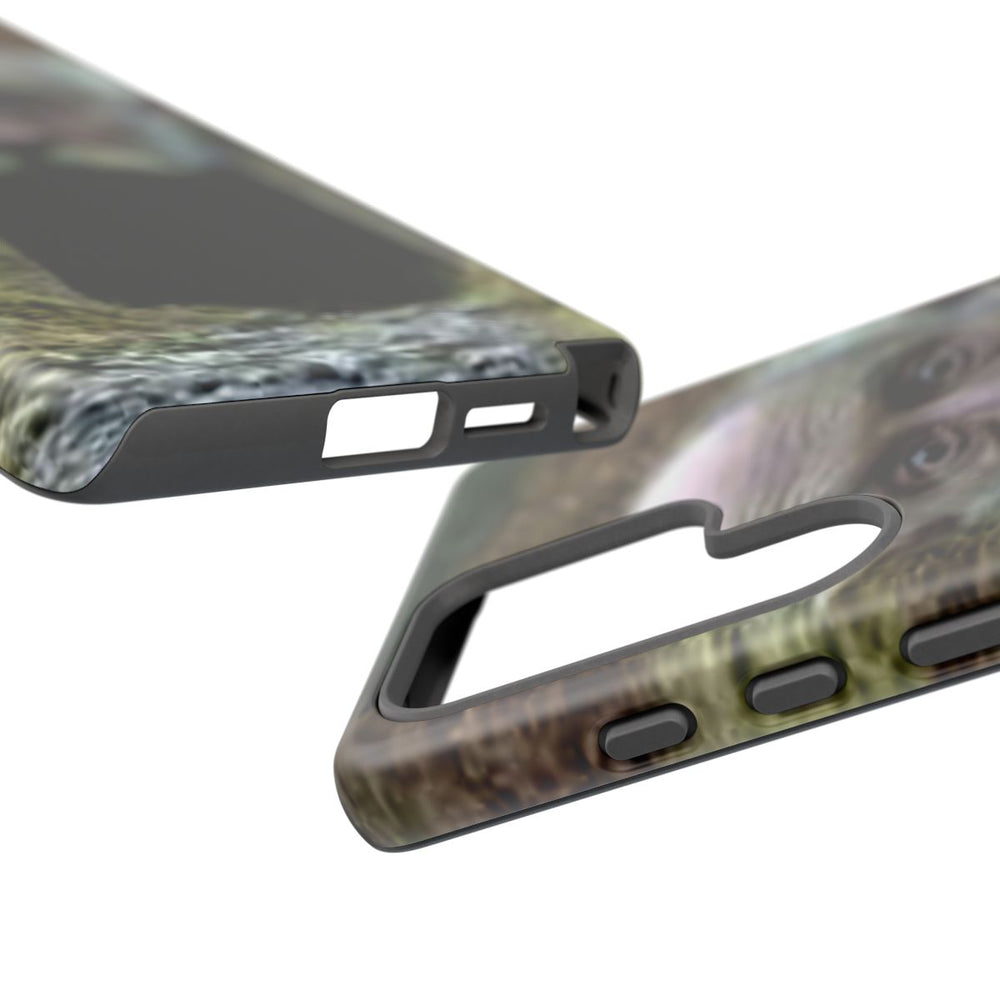 Dit hoesje toont een surrealistisch tafereel van een groot, kaal mensenhoofd met opvallende oren en een snor, dat uit een heuvel lijkt te komen. Het hoofd vormt de toegang tot een opening in de aarde, met een donkere doorgang onder het gezicht. Rondom het hoofd zie je een natuurlijke omgeving met gras en met mos bedekte grond. Dit matte, stevige hoesje is gemaakt van polycarbonaat en TPU voor extra duurzaamheid en bescherming buitenshuis, en ondersteunt draadloos opladen.