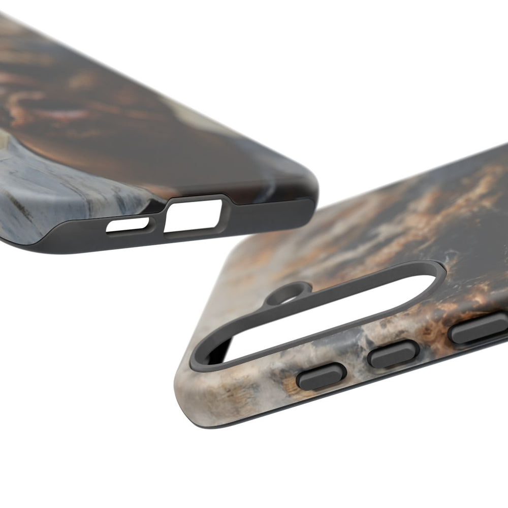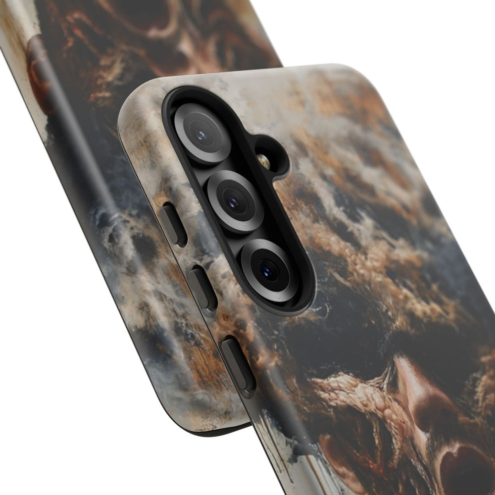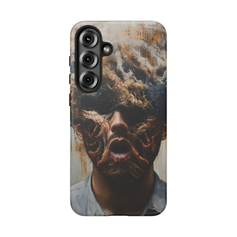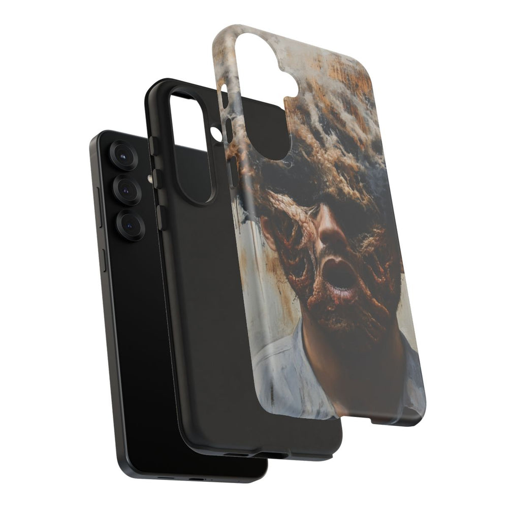 Dit hoesje is voorzien van een surrealistisch portret van een persoon wiens gezicht lijkt te veranderen in draaiende rook en as. Het kunstwerk combineert donkere, getextureerde elementen die overvloeien in opstijgende rook, wat zorgt voor een dramatisch en intens visueel effect. De persoon draagt een lichtgekleurde blouse en de neutrale achtergrond met abstracte vegen en strepen versterkt het artistieke karakter. Het hoesje heeft een dubbele laag voor extra bescherming en is geschikt voor draadloos opladen.