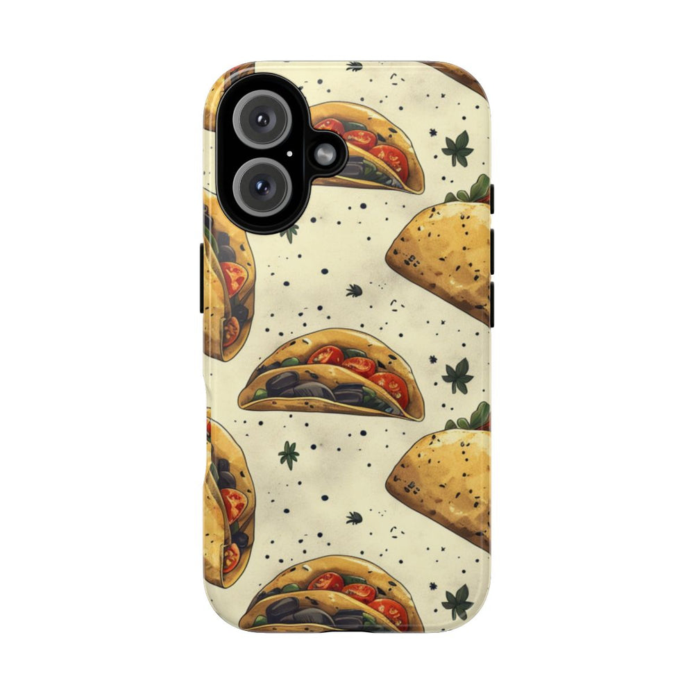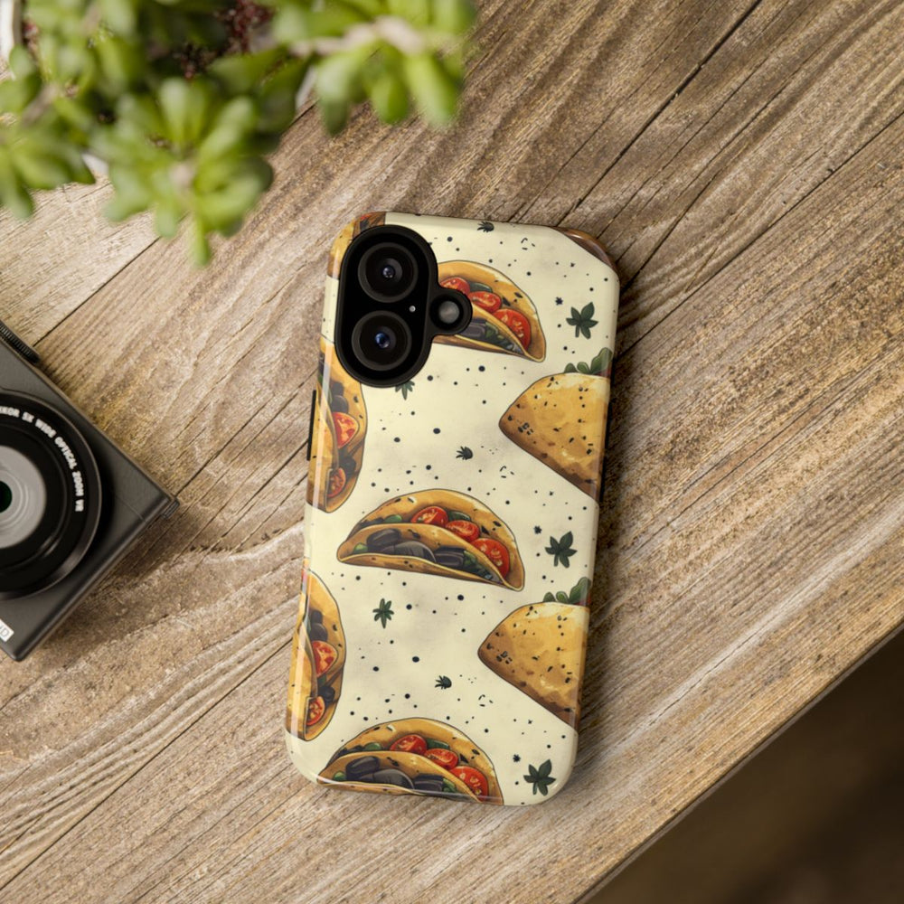 Dit telefoonhoesje heeft een vrolijk patroon van getekende taco’s, gevuld met ingrediënten zoals tomaat, olijven en groene bladgroenten. De taco’s hebben een goudbruine, getextureerde korst met kleine spikkels voor extra detail. Op de lichtbeige achtergrond zijn groene kruidenblaadjes en zwarte stipjes verspreid, wat zorgt voor een levendig en smakelijk geheel. Het hoesje is glanzend afgewerkt en bestaat uit twee stevige lagen voor optimale bescherming. Ondersteunt draadloos opladen.