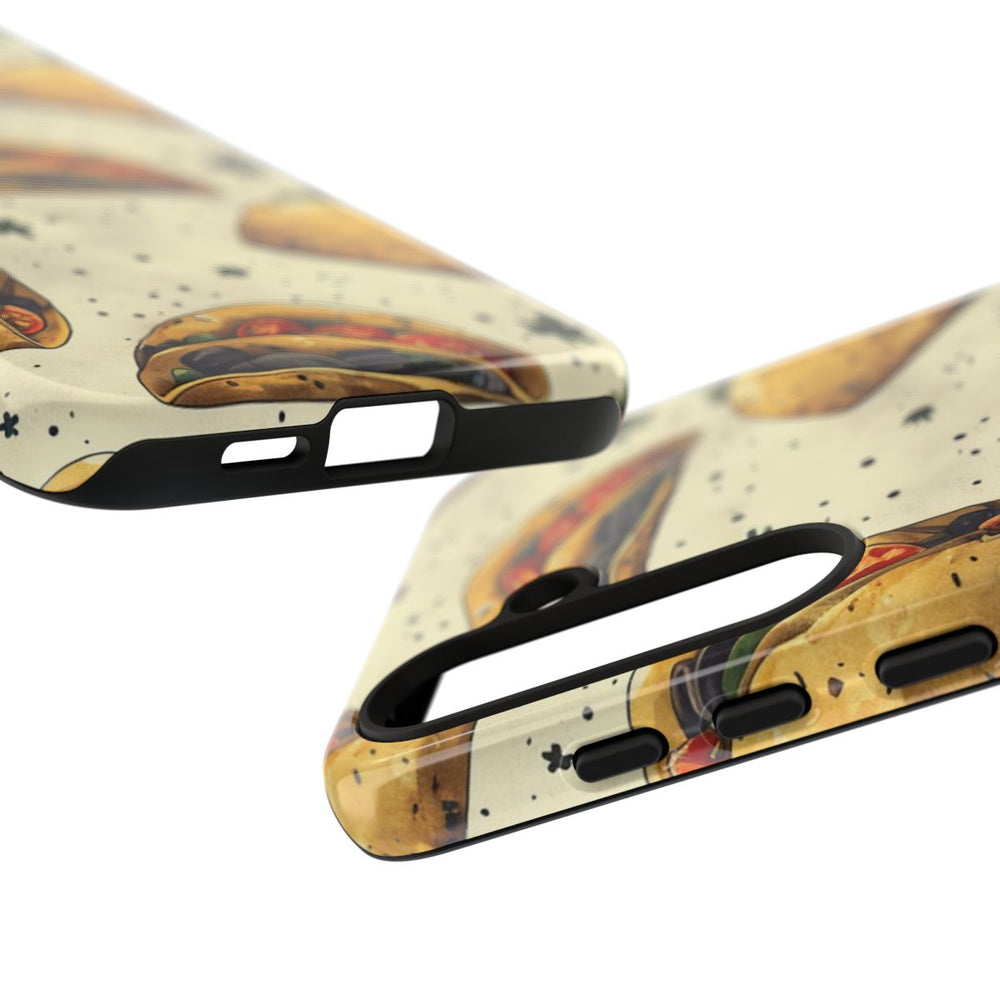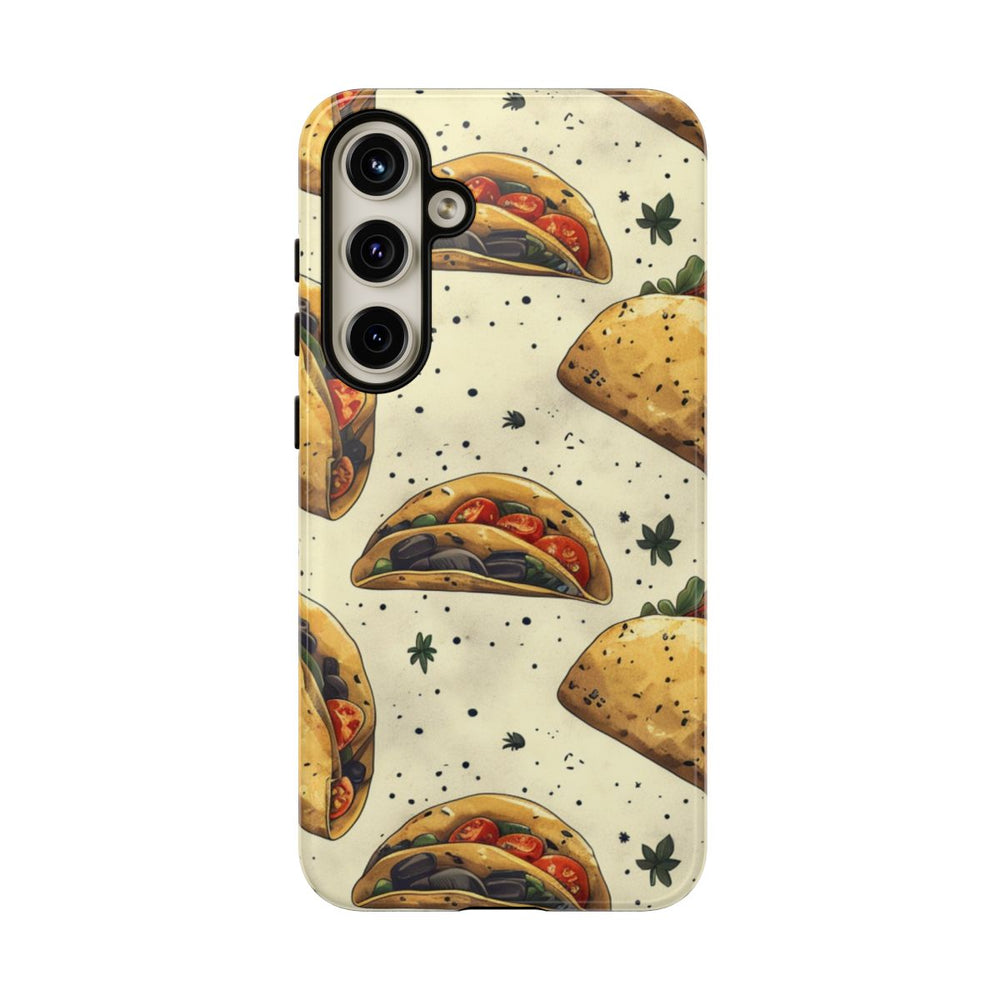 Dit telefoonhoesje heeft een vrolijk patroon van getekende taco’s, gevuld met ingrediënten zoals tomaat, olijven en groene bladgroenten. De taco’s hebben een goudbruine, getextureerde korst met kleine spikkels voor extra detail. Op de lichtbeige achtergrond zijn groene kruidenblaadjes en zwarte stipjes verspreid, wat zorgt voor een levendig en smakelijk geheel. Het hoesje is glanzend afgewerkt en bestaat uit twee stevige lagen voor optimale bescherming. Ondersteunt draadloos opladen.