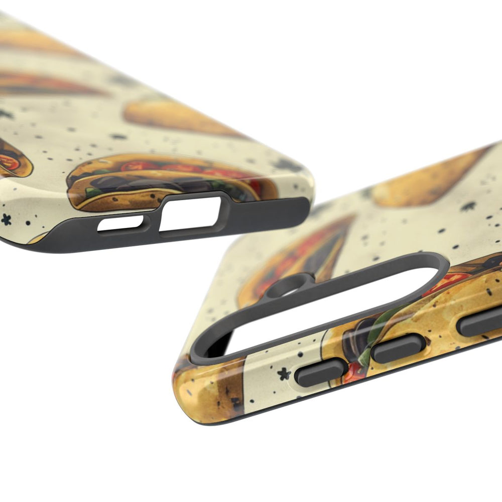 Dit telefoonhoesje heeft een vrolijk patroon van getekende taco’s, gevuld met ingrediënten zoals tomaat, olijven en groene bladgroenten. De taco’s hebben een goudbruine, getextureerde korst met kleine spikkels voor extra detail. Op de lichtbeige achtergrond zijn groene kruidenblaadjes en zwarte stipjes verspreid, wat zorgt voor een levendig en smakelijk geheel. Het hoesje is glanzend afgewerkt en bestaat uit twee stevige lagen voor optimale bescherming. Ondersteunt draadloos opladen.