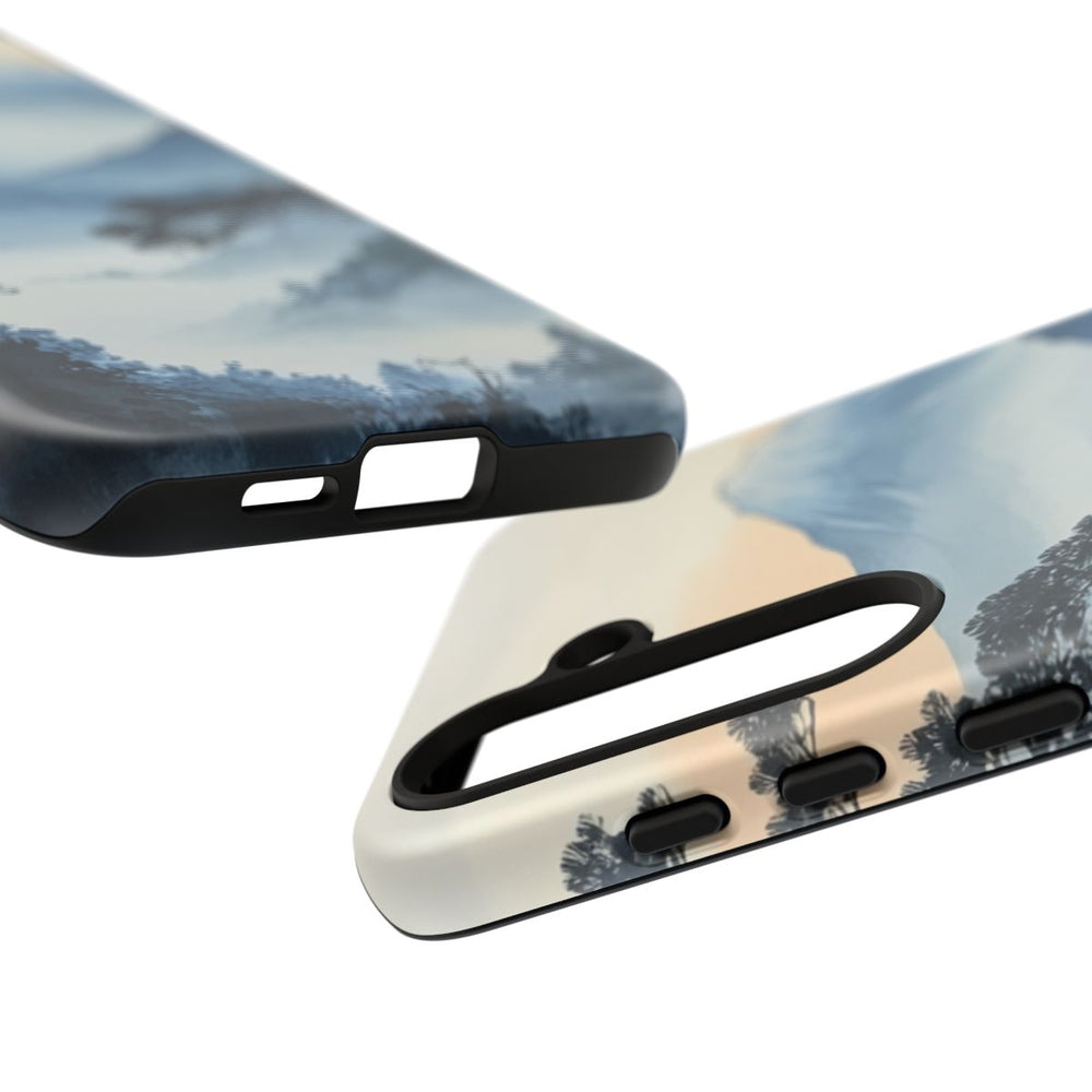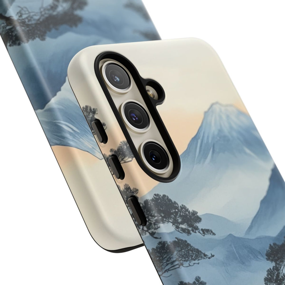 Dit hoesje is voorzien van een sereen, traditioneel Japans berglandschap. Het ontwerp toont een imposante berg met besneeuwde top, omringd door glooiende heuvels en bomen. De zachte blauwtinten en pastelkleurige accenten zorgen voor een rustgevende uitstraling. De natuurpracht komt tot leven dankzij de gedetailleerde bomen die het tafereel omlijsten. Het ontwerp is gedrukt op een mat, stevig hoesje en biedt zo een stijlvolle én beschermende accessoire voor je toestel.