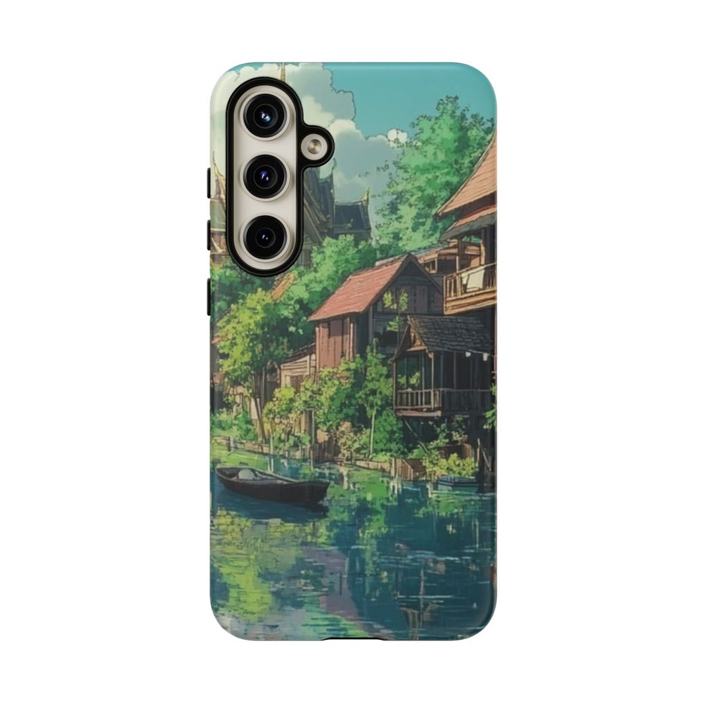Dit hoesje toont een rustgevend tafereel aan de rivier met traditionele houten huizen langs de oever. Het kalme water weerspiegelt de weelderig groene bomen en de heldere blauwe lucht. Op de achtergrond verrijzen sierlijke tempelgebouwen met gouden en witte torenspitsen. Kleine bootjes drijven rustig op het water en op de houten steiger zit een persoon, wat een vredig en menselijk accent geeft aan deze serene omgeving. Het hoesje bestaat uit twee lagen met een matte afwerking, een stevige polycarbonaat buitenkant en een TPU-binnenzijde. Geschikt voor draadloos opladen.