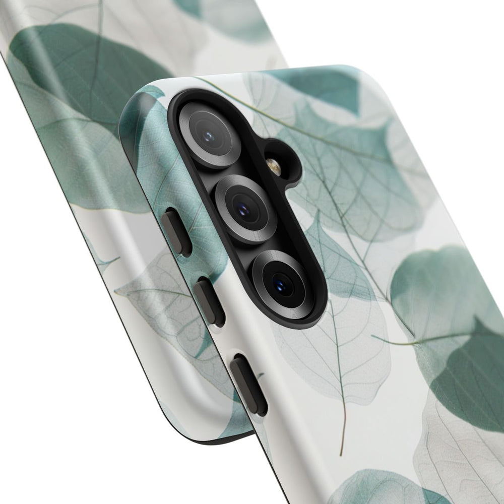 Dit hoesje heeft een verfijnd patroon van doorschijnende bladeren in verschillende blauwtinten. De bladeren overlappen elkaar subtiel op een witte achtergrond en laten fijne nerven zien voor een lichte, luchtige uitstraling. De afbeelding is aangebracht op een mat, stevig hoesje met een dubbele laag van polycarbonaat en TPU, wat zorgt voor extra stevigheid en bescherming. Het hoesje ondersteunt draadloos opladen en is bestand tegen invloeden van buitenaf, zodat de kwaliteit langdurig behouden blijft.