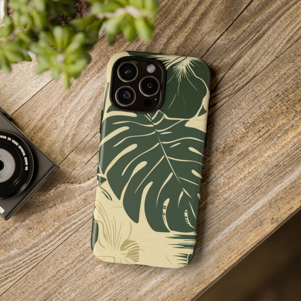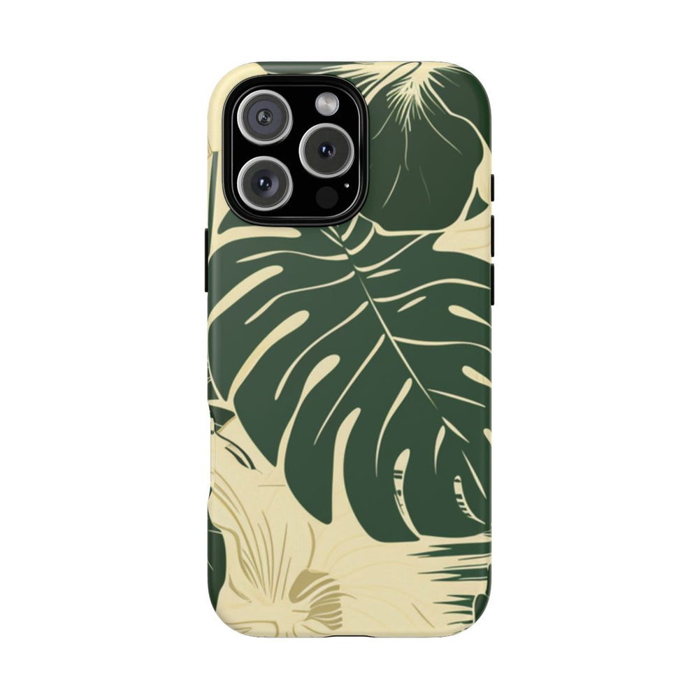 Dit telefoonhoesje heeft een herhalend patroon van tropische bladeren en bloemen in een minimalistische stijl. Het ontwerp maakt gebruik van twee hoofdkleuren: donkergroen voor de bladeren en bloemen, en een lichtbeige achtergrond. De fijne lijntekeningen benadrukken de nerven en vormen van de bladeren en bloemblaadjes. Het matte hoesje bestaat uit een stevige polycarbonaat buitenkant en een TPU-binnenzijde, wat zorgt voor dubbele bescherming en ondersteuning voor draadloos opladen. Het ontwerp geeft een natuurlijke, botanische uitstraling met een strak en grafisch karakter.