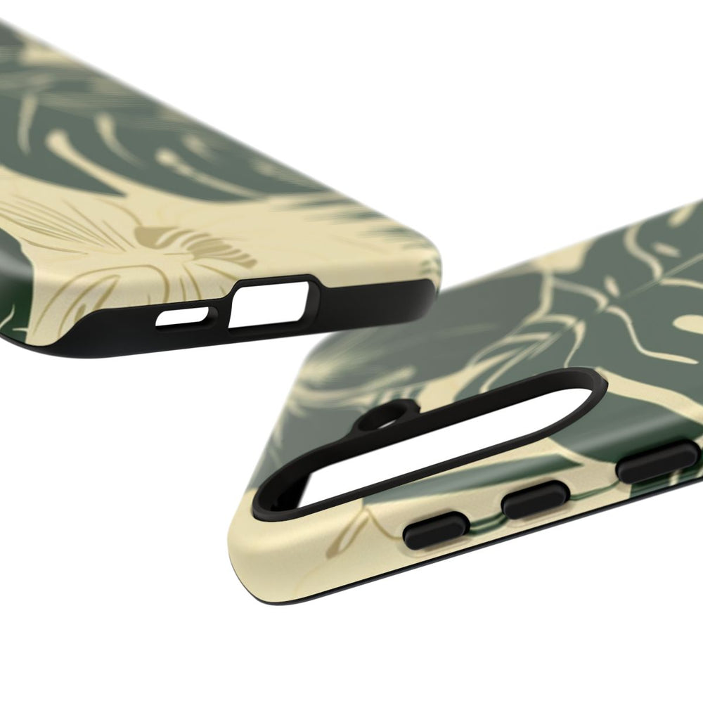 Dit telefoonhoesje heeft een herhalend patroon van tropische bladeren en bloemen in een minimalistische stijl. Het ontwerp maakt gebruik van twee hoofdkleuren: donkergroen voor de bladeren en bloemen, en een lichtbeige achtergrond. De fijne lijntekeningen benadrukken de nerven en vormen van de bladeren en bloemblaadjes. Het matte hoesje bestaat uit een stevige polycarbonaat buitenkant en een TPU-binnenzijde, wat zorgt voor dubbele bescherming en ondersteuning voor draadloos opladen. Het ontwerp geeft een natuurlijke, botanische uitstraling met een strak en grafisch karakter.