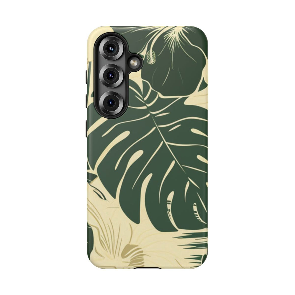 Dit telefoonhoesje heeft een herhalend patroon van tropische bladeren en bloemen in een minimalistische stijl. Het ontwerp maakt gebruik van twee hoofdkleuren: donkergroen voor de bladeren en bloemen, en een lichtbeige achtergrond. De fijne lijntekeningen benadrukken de nerven en vormen van de bladeren en bloemblaadjes. Het matte hoesje bestaat uit een stevige polycarbonaat buitenkant en een TPU-binnenzijde, wat zorgt voor dubbele bescherming en ondersteuning voor draadloos opladen. Het ontwerp geeft een natuurlijke, botanische uitstraling met een strak en grafisch karakter.
