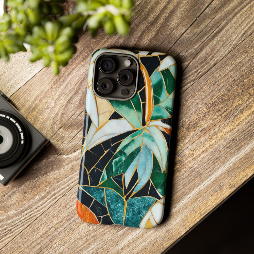 Dit telefoonhoesje heeft een levendig mozaïekpatroon van tropische bladeren in diverse tinten groen, geel, oranje, wit en blauw. De bladeren zijn omlijnd met goudkleurige lijnen, wat zorgt voor een glas-in-lood effect. De zwarte achtergrond laat de kleurrijke bladeren extra opvallen. Het hoesje is glanzend en stevig dankzij de polycarbonaat buitenkant en TPU binnenzijde, wat zorgt voor dubbele bescherming en ondersteuning voor draadloos opladen. Het ontwerp straalt een tropische, artistieke sfeer uit en heeft een marmerachtige textuur.