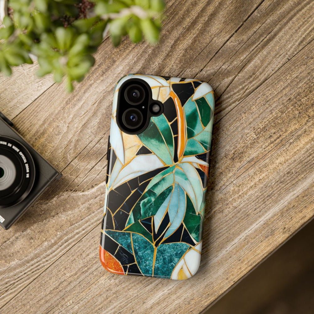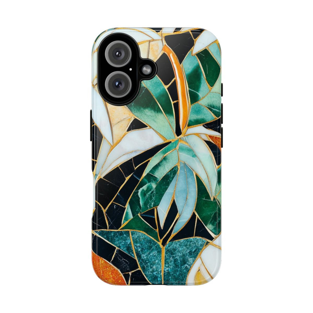 Dit telefoonhoesje heeft een levendig mozaïekpatroon van tropische bladeren in diverse tinten groen, geel, oranje, wit en blauw. De bladeren zijn omlijnd met goudkleurige lijnen, wat zorgt voor een glas-in-lood effect. De zwarte achtergrond laat de kleurrijke bladeren extra opvallen. Het hoesje is glanzend en stevig dankzij de polycarbonaat buitenkant en TPU binnenzijde, wat zorgt voor dubbele bescherming en ondersteuning voor draadloos opladen. Het ontwerp straalt een tropische, artistieke sfeer uit en heeft een marmerachtige textuur.